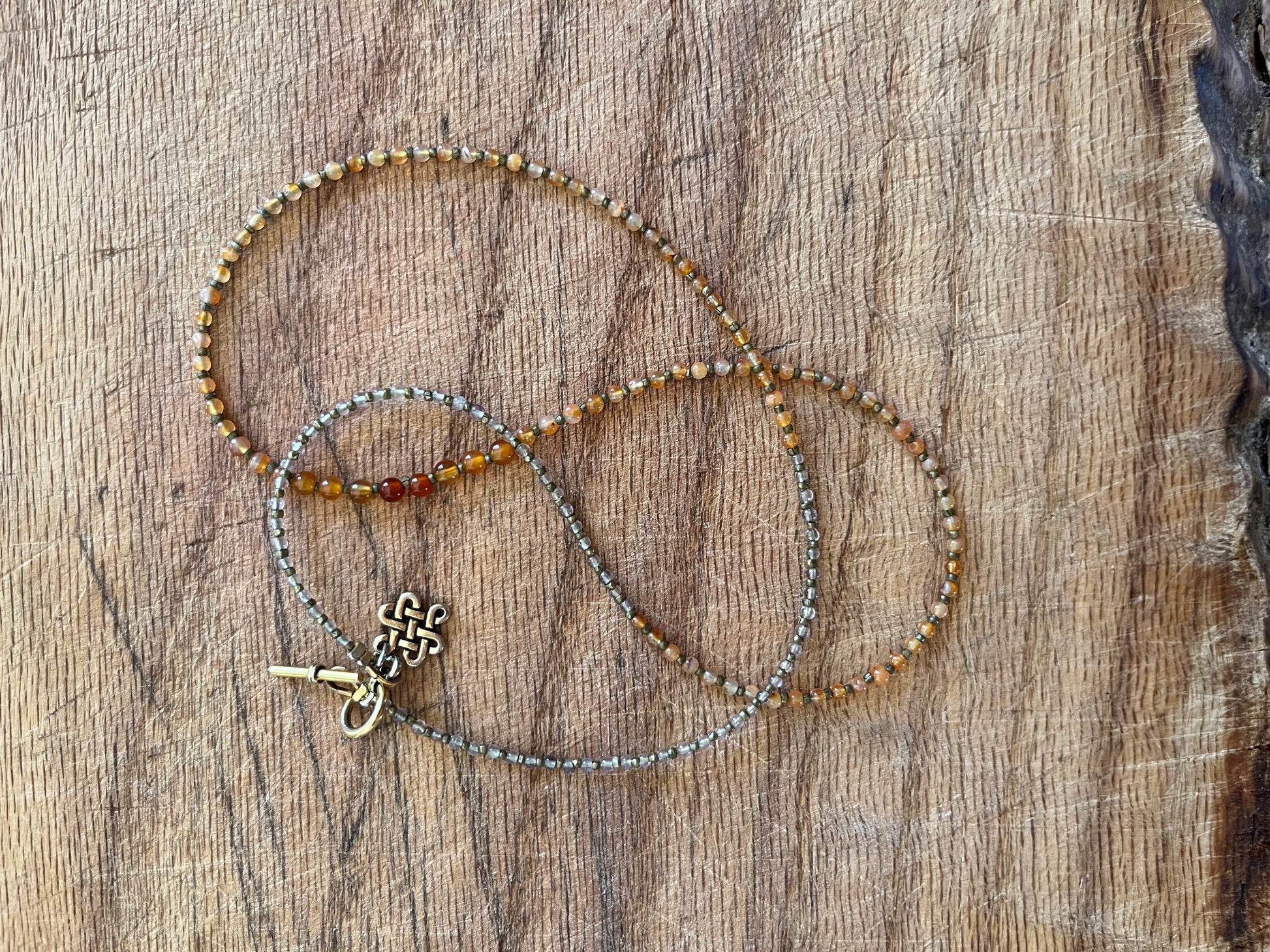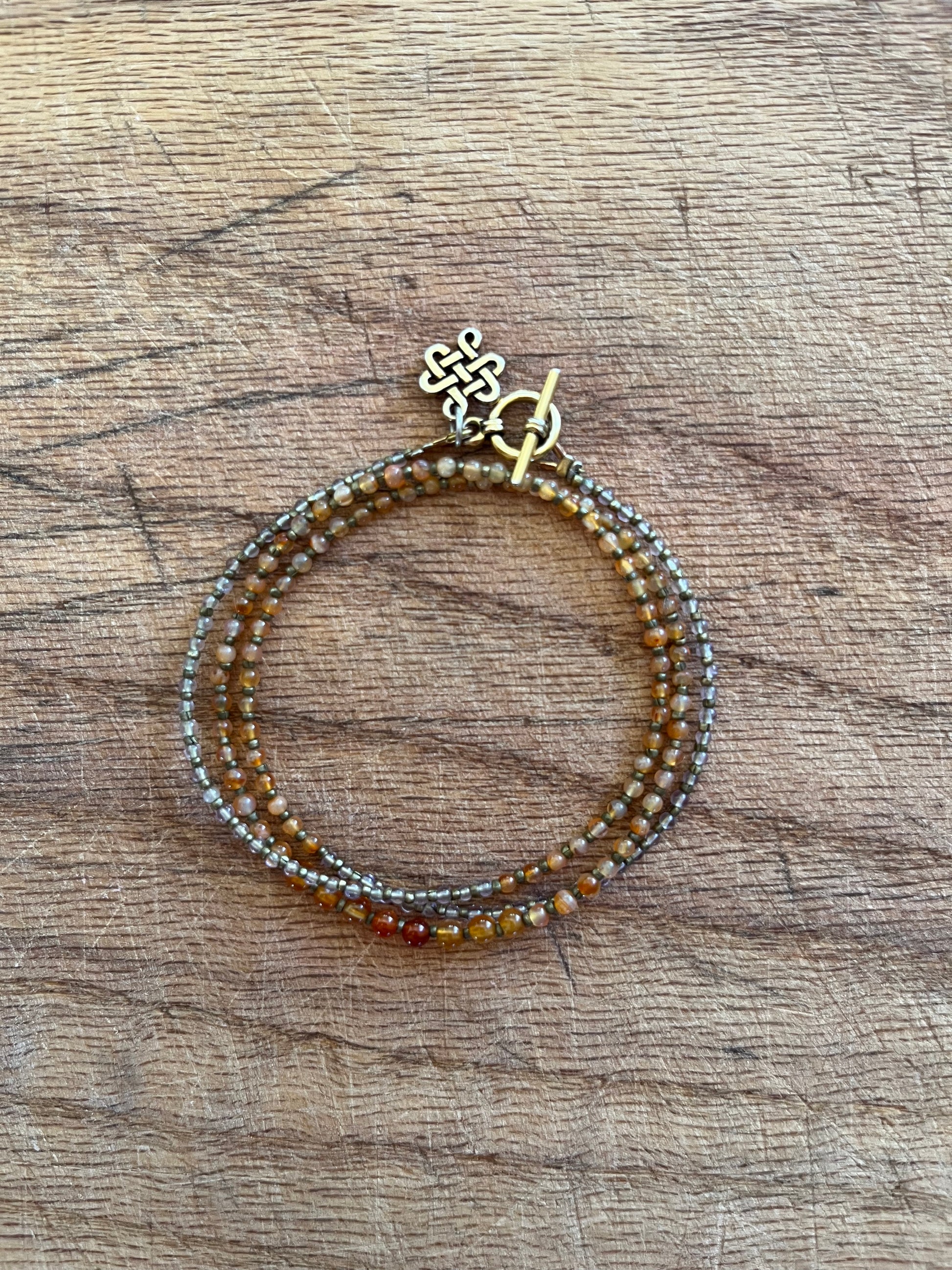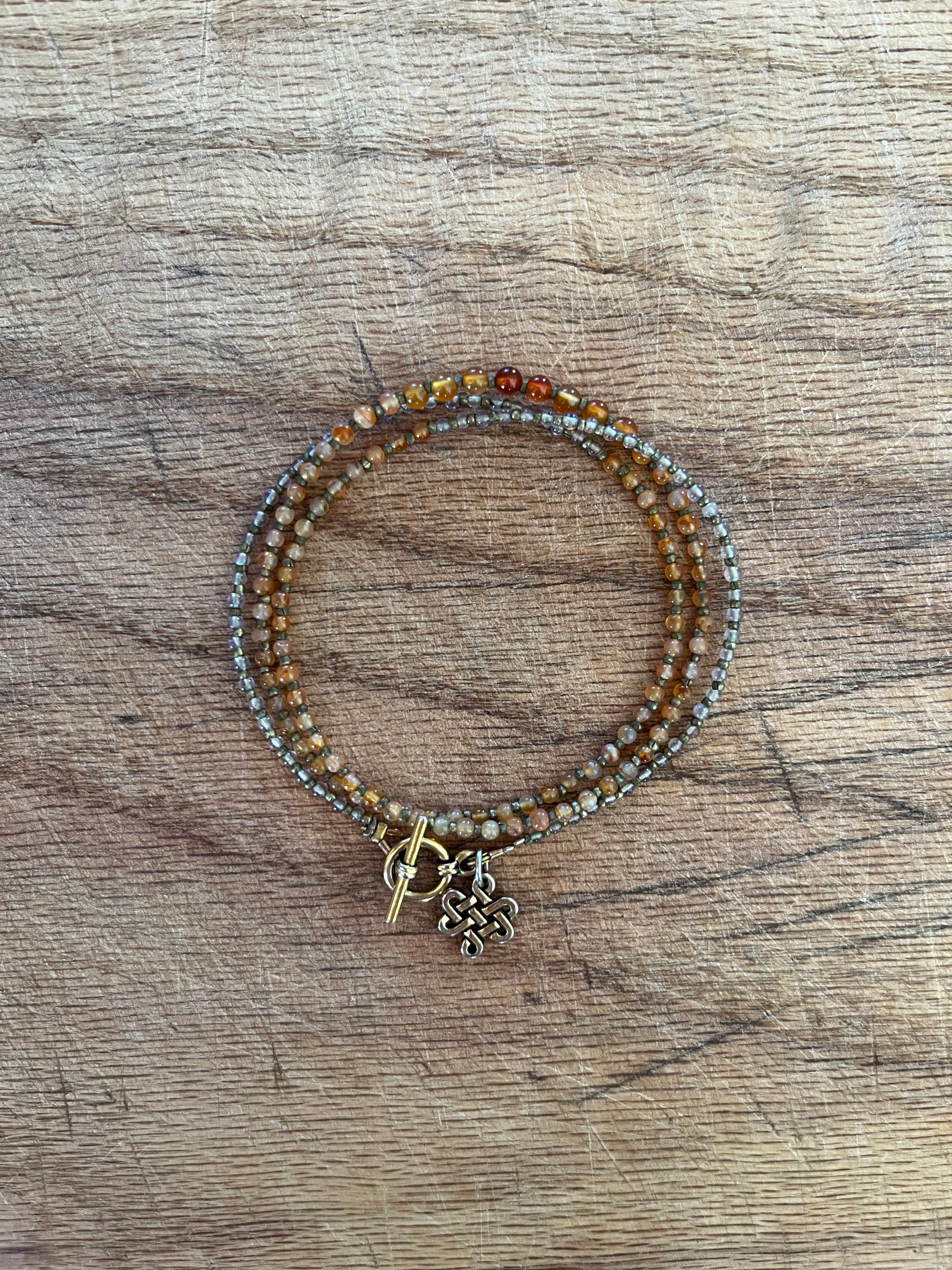 The Sanskrit word bhava means being, worldly existence, becoming, or origin. Wear this piece to connect with your deepest core of self. Made from agate, carnelian, and amethyst polished rounds, and finished with a tiny Tibetan infinity knot. This knot, called palbeu in Tibetan and shrivasta in Sanskrit, has no beginning and no end. It symbolizes the endless wisdom and compassion of the Buddha. Finished with a gold plated toggle.