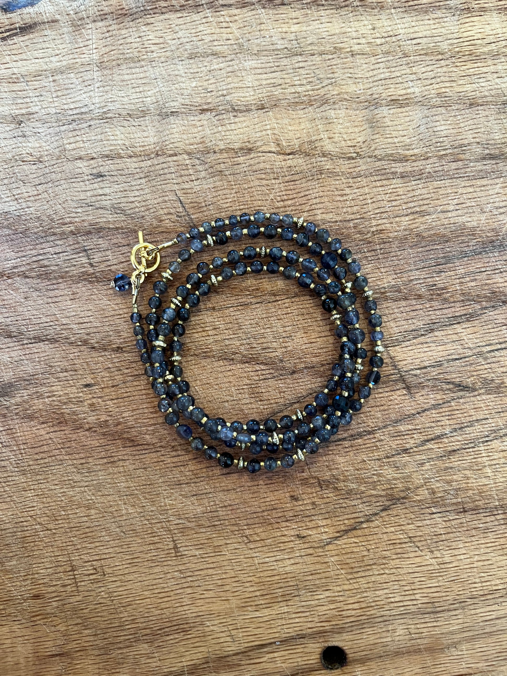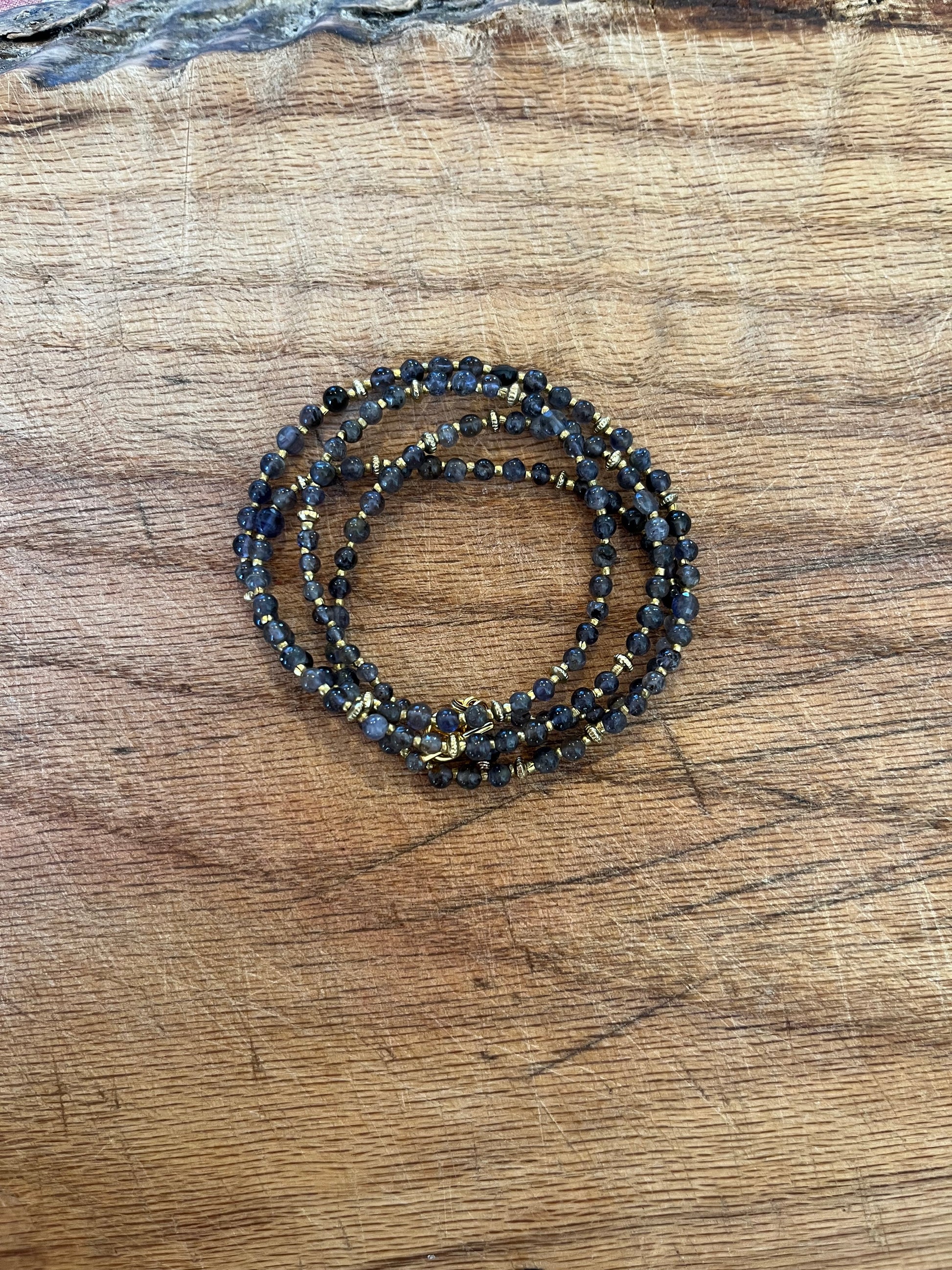 Beautiful stormy-blue iolite, in polished rounds and faceted puff coins, interspersed with textured mixed metal heishi beads. Named after the mystical selkies of Scottish lore; similar to mermaids, selkies are mythological creatures of the sea who can shapeshift from seal form whilst living in the sea to human form on land. Featuring prominently in Celtic and Norse lore, selkies (or "seal folk") could be friendly and helpful to humans, but also be dangerous and vengeful. Often depicted as attractive and seductive in their human form, there are many stories involving selkies having romantic or sexual relationships with humans. This wrap bracelet, which can also be worn as a necklace, invokes that mysterious and seductive nature of the selkie.