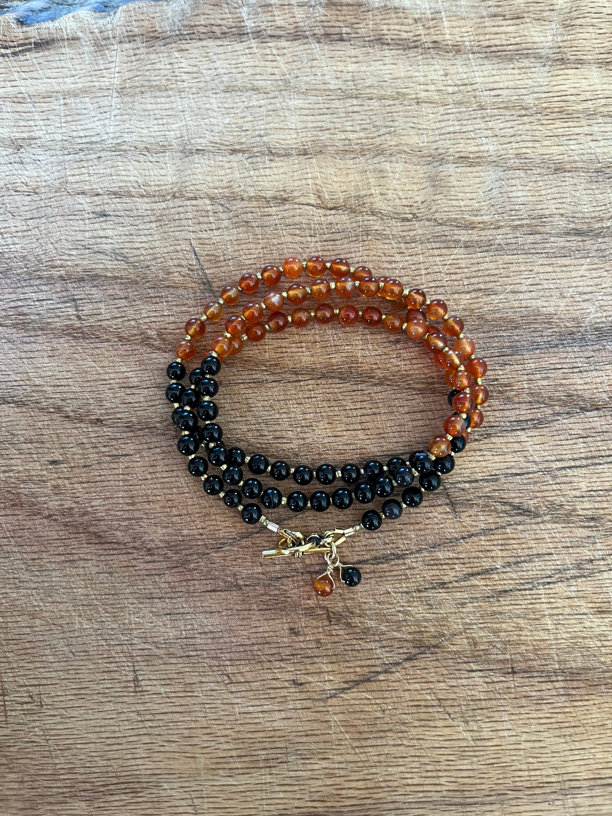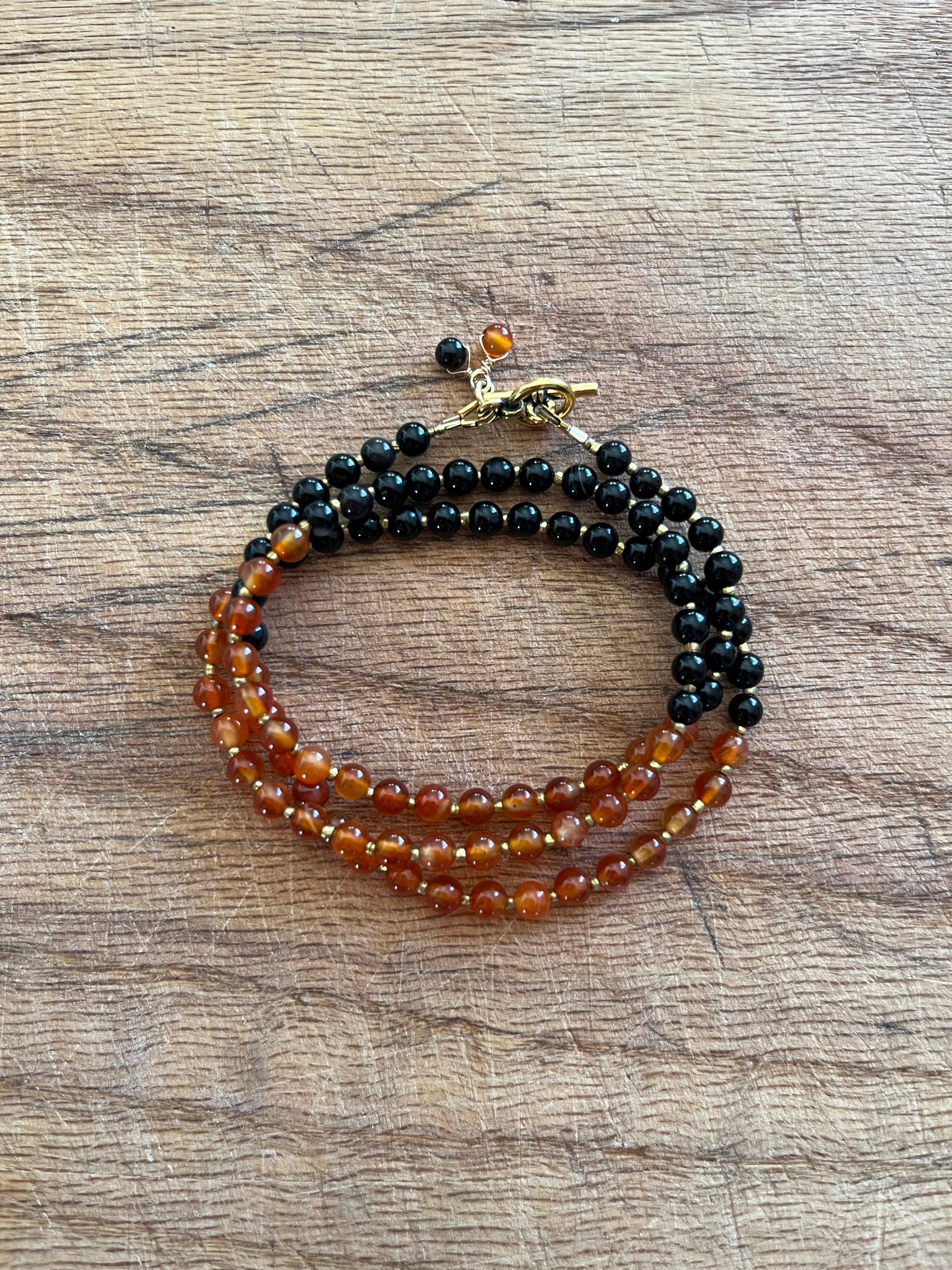 Who doesn't want a constant reminder of the world's most gorgeous fruit, on their wrist or neck at all times? This piece evokes the rich orange flesh (in carnelian) and shiny seductive seeds (black agate) of the juicy papaya. Finished with hand-wrapped charms of carnelian and black agate, and a gold plated toggle. Yum!
