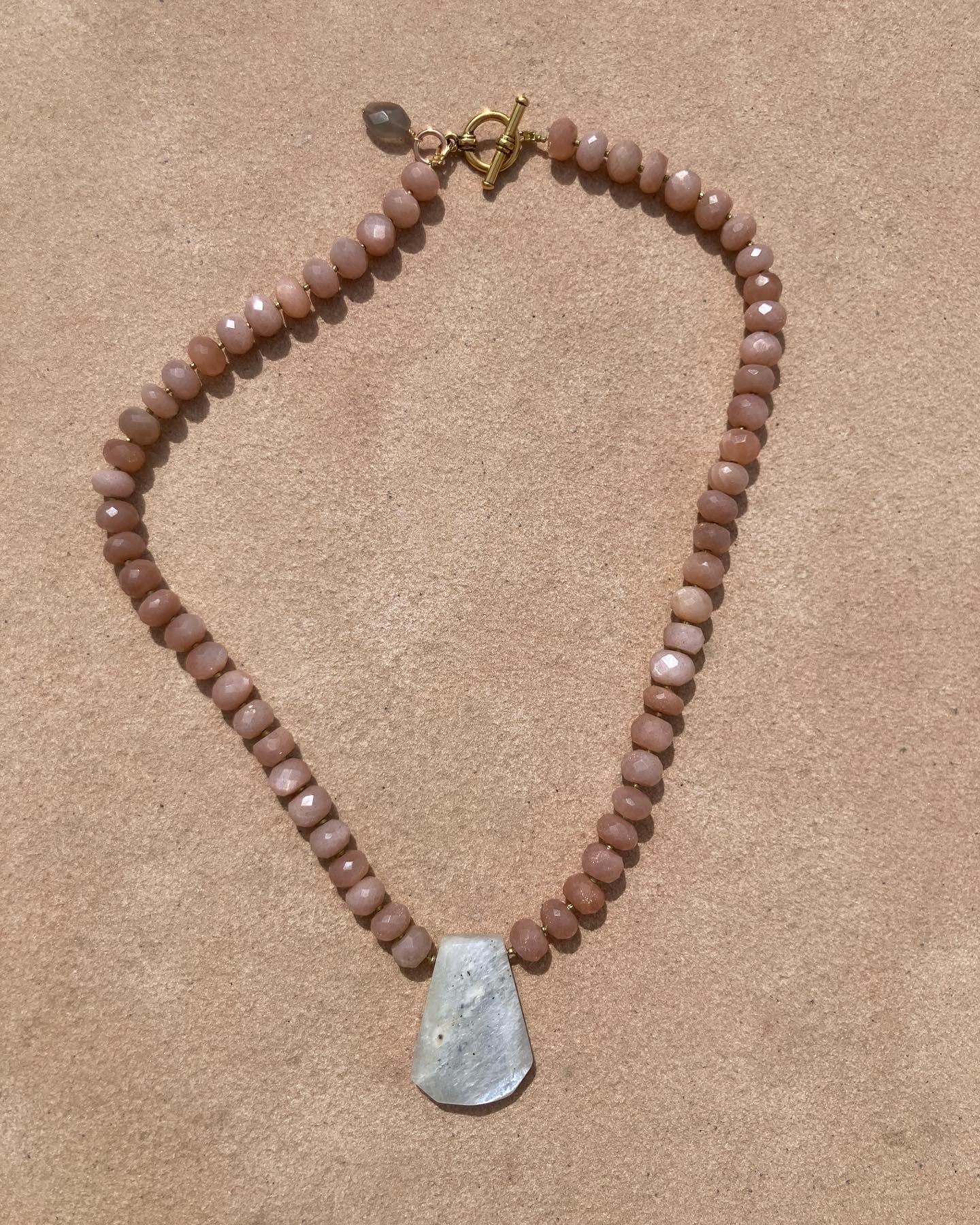Mystical statement necklace of peach moonstone faceted rondelles, with a flecked gray moonstone faceted hexagon pendant; finished with gold plated clasp and hand-wrapped gray moonstone charm.