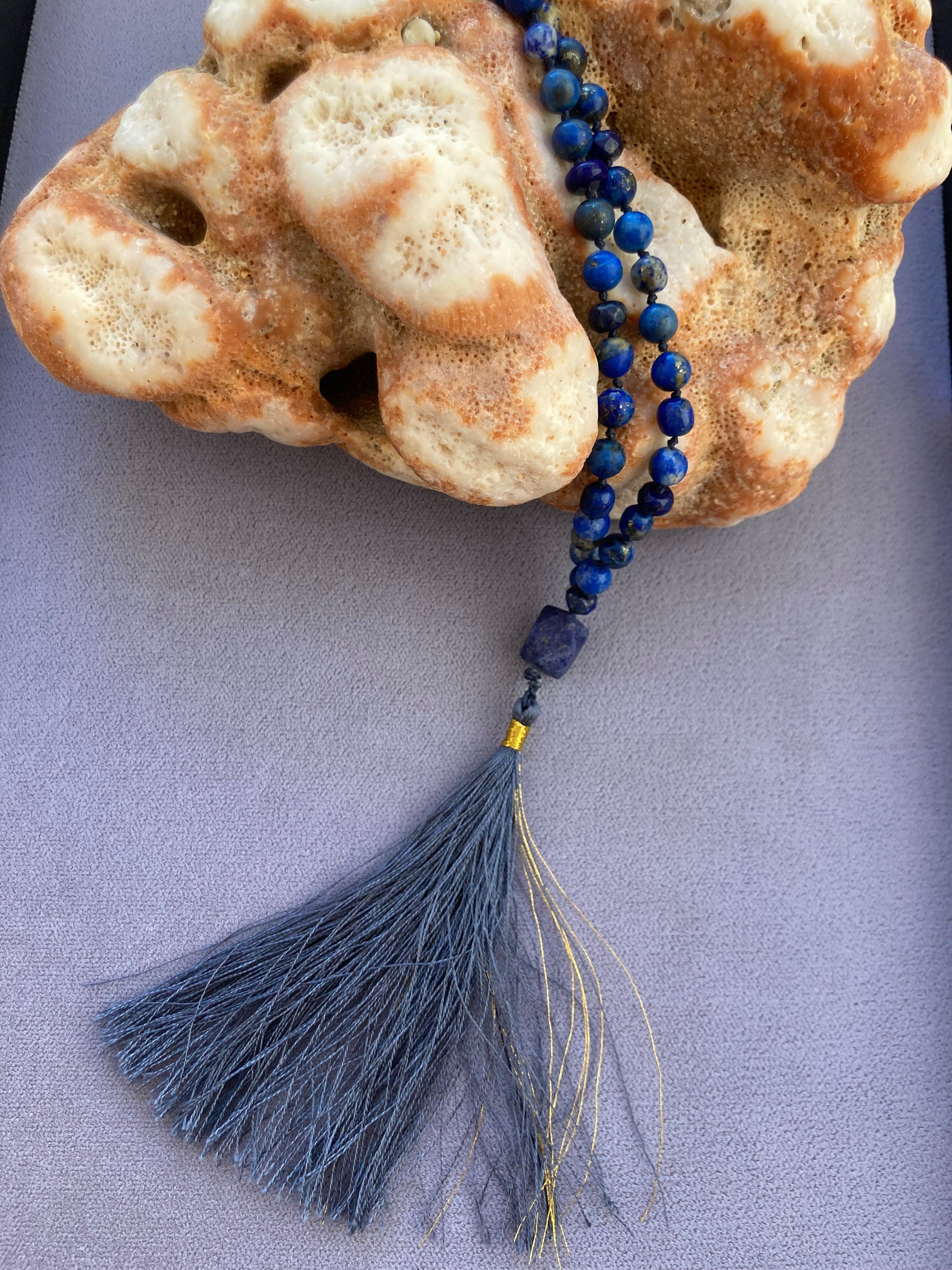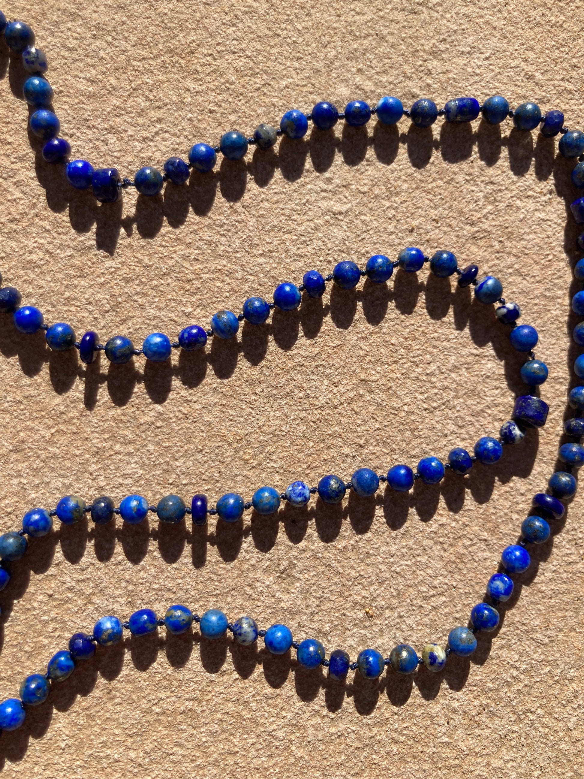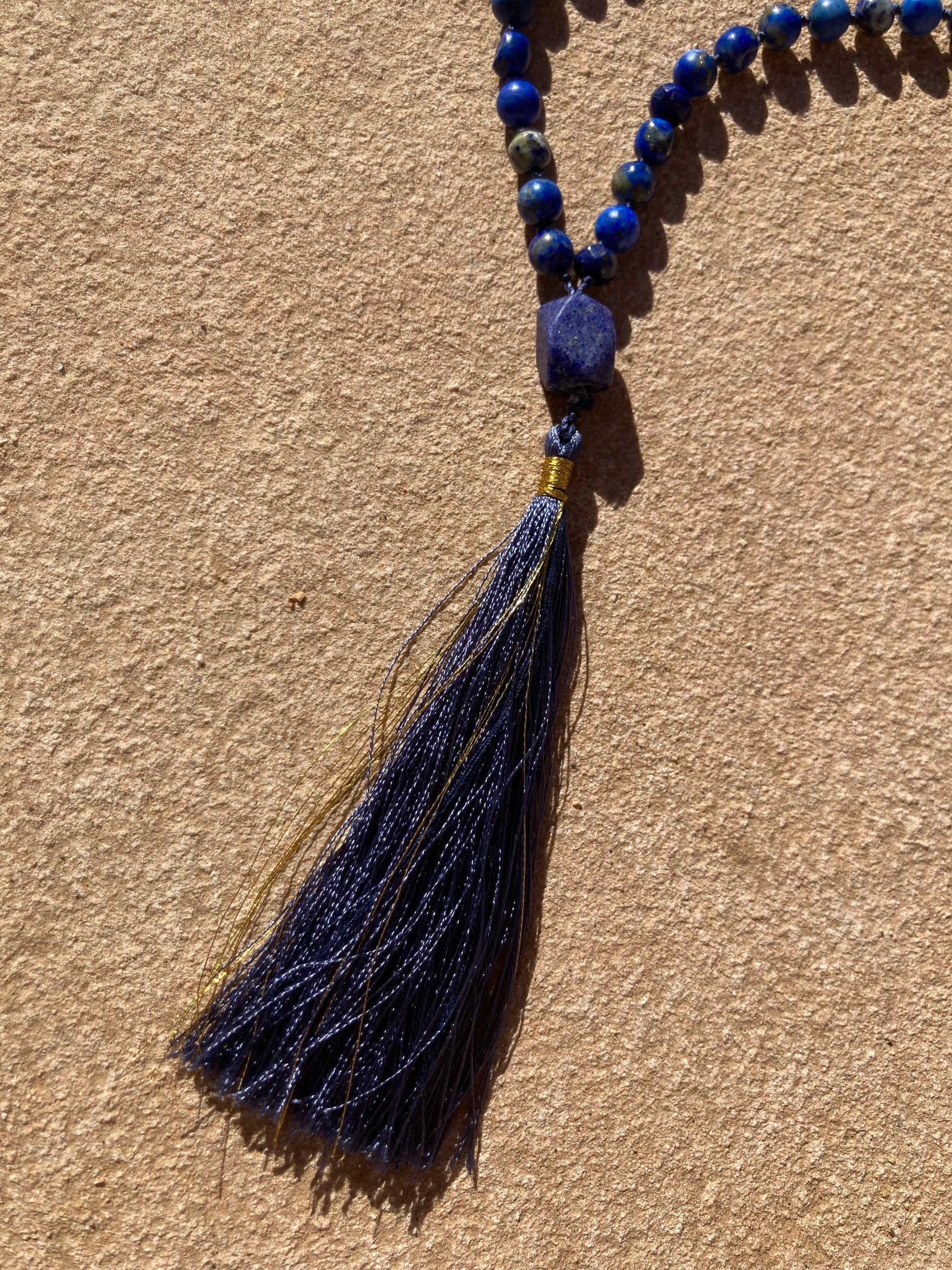 Rich irregular lapis lazuli beads, hand knotted and finished with a silk tassel.