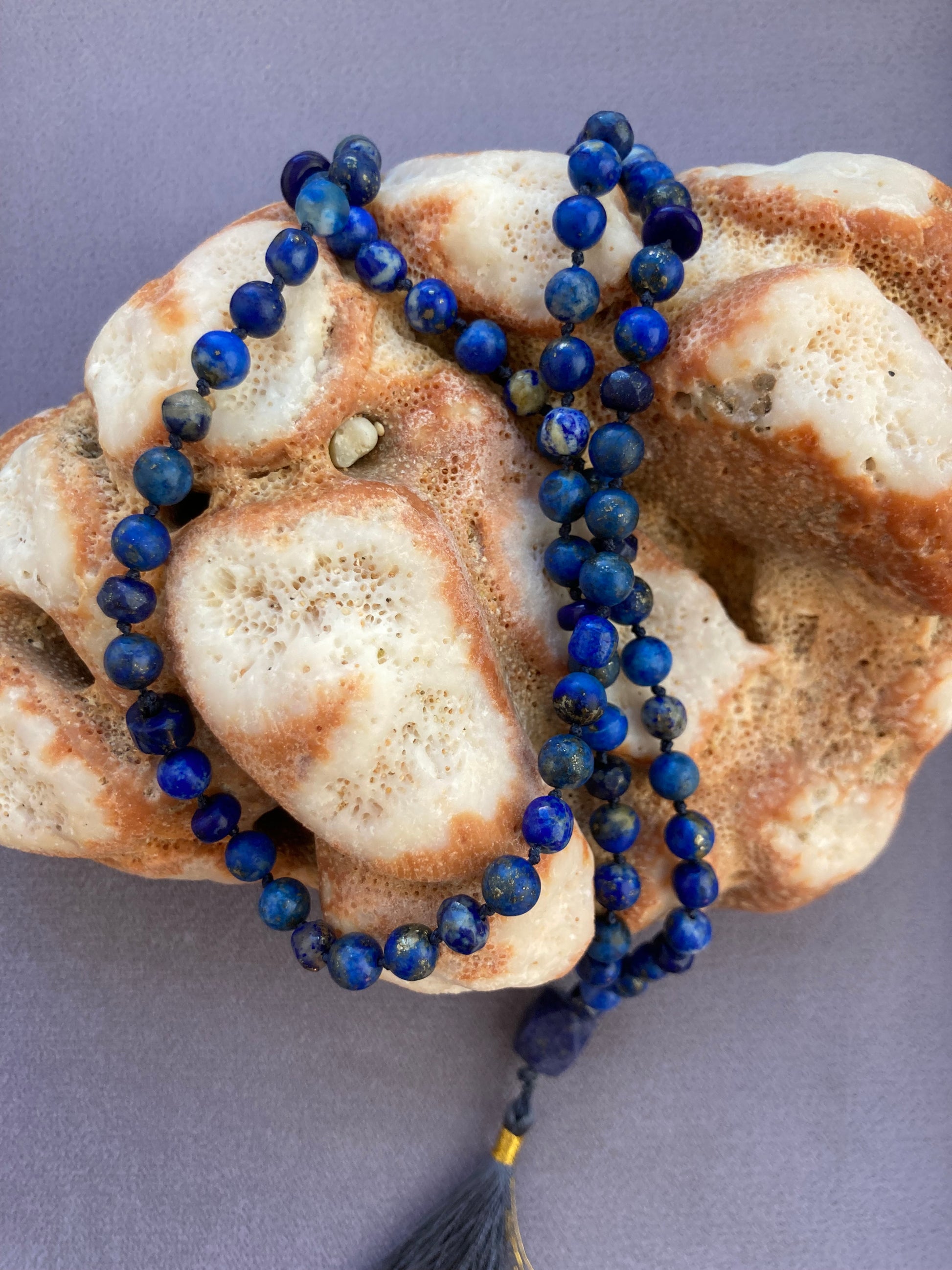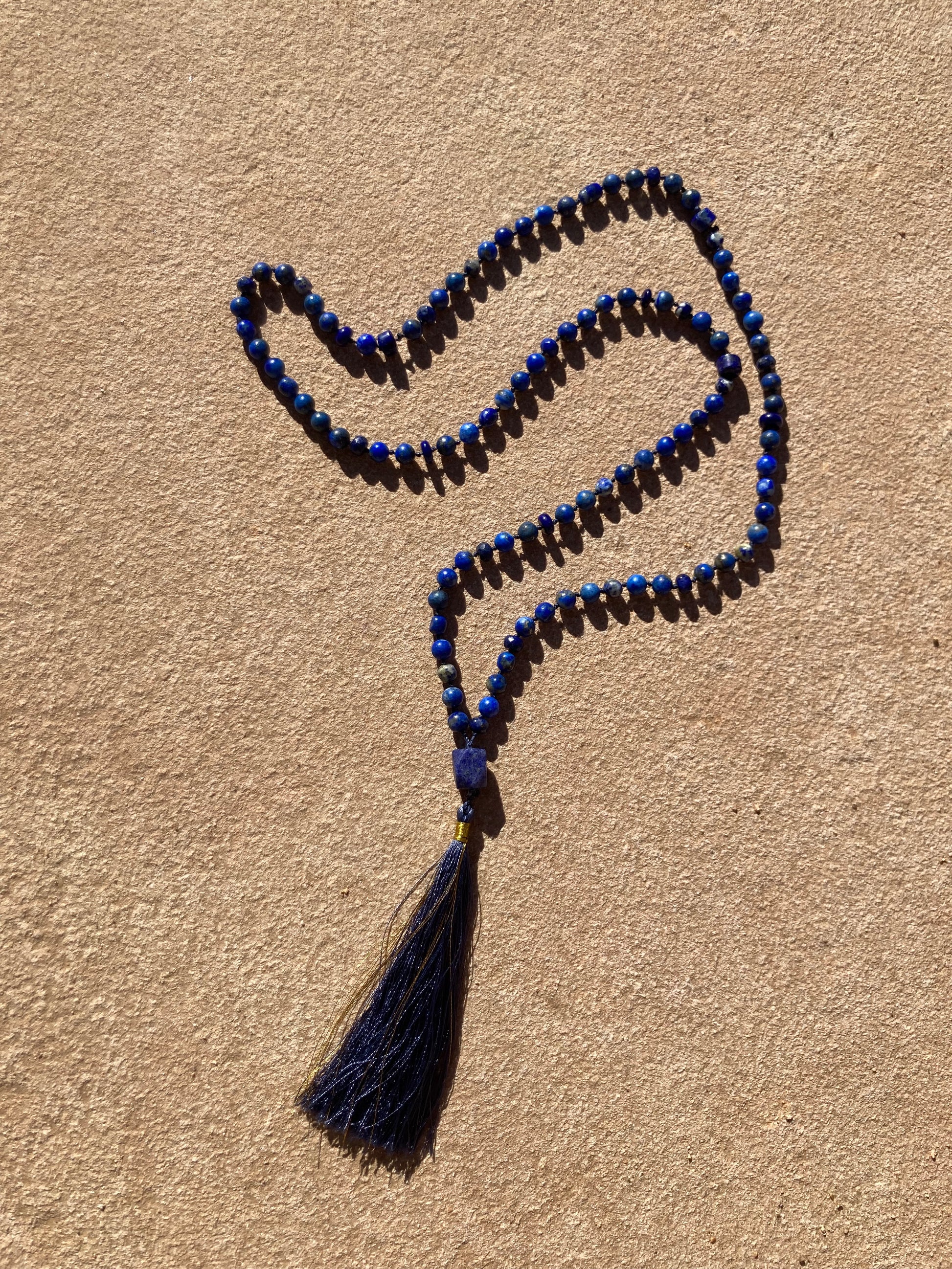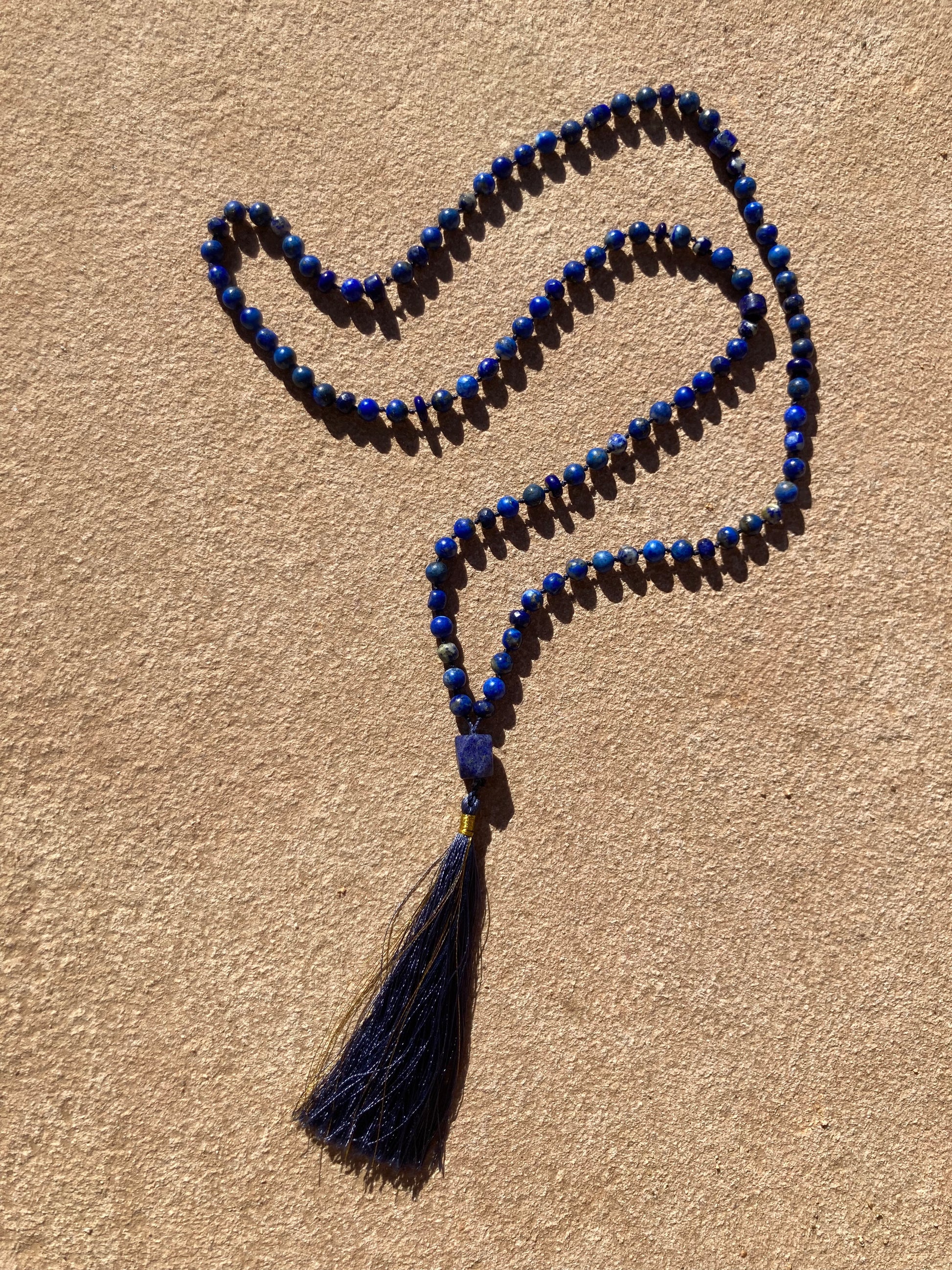 Rich irregular lapis lazuli beads, hand knotted and finished with a silk tassel.