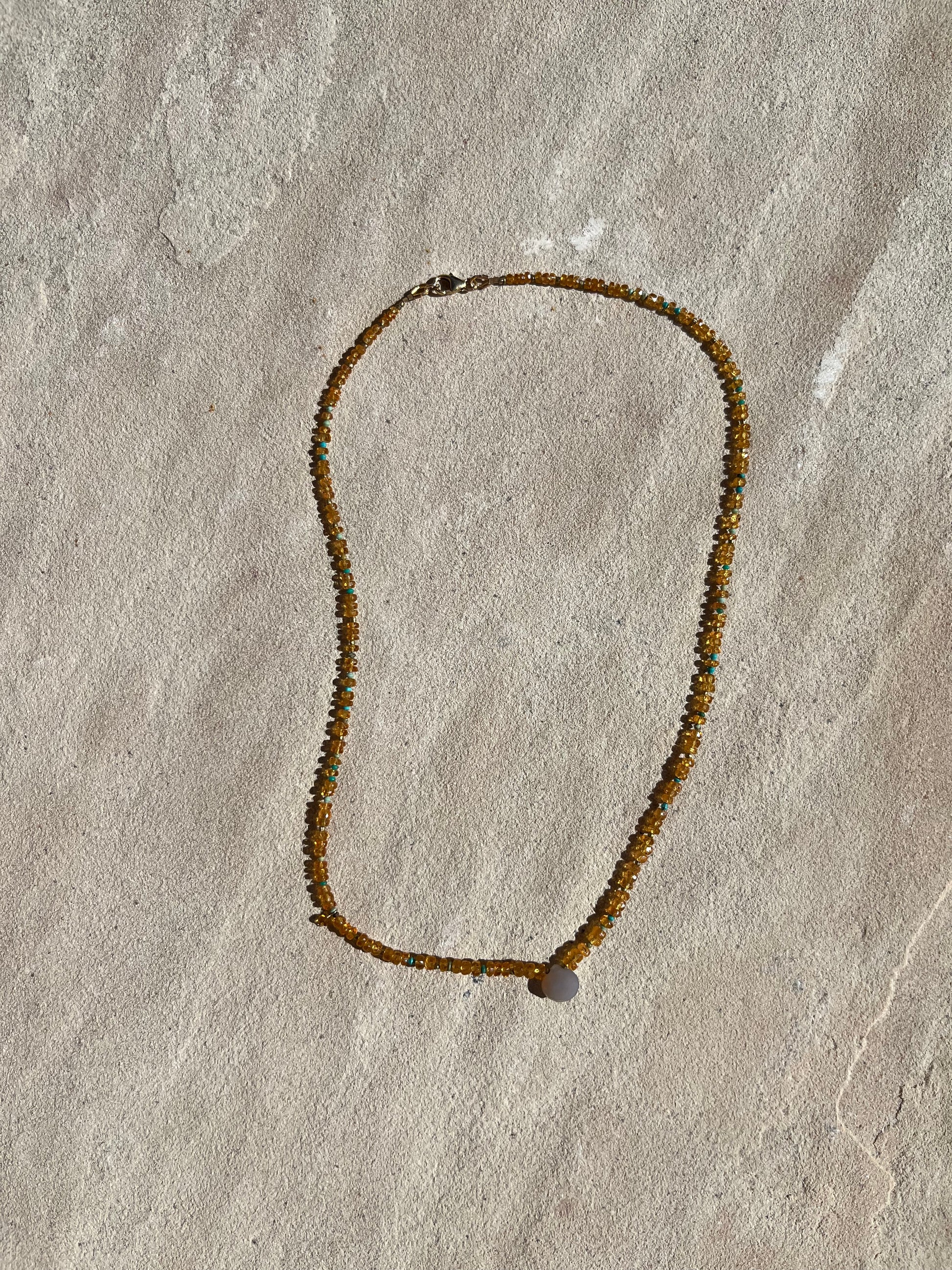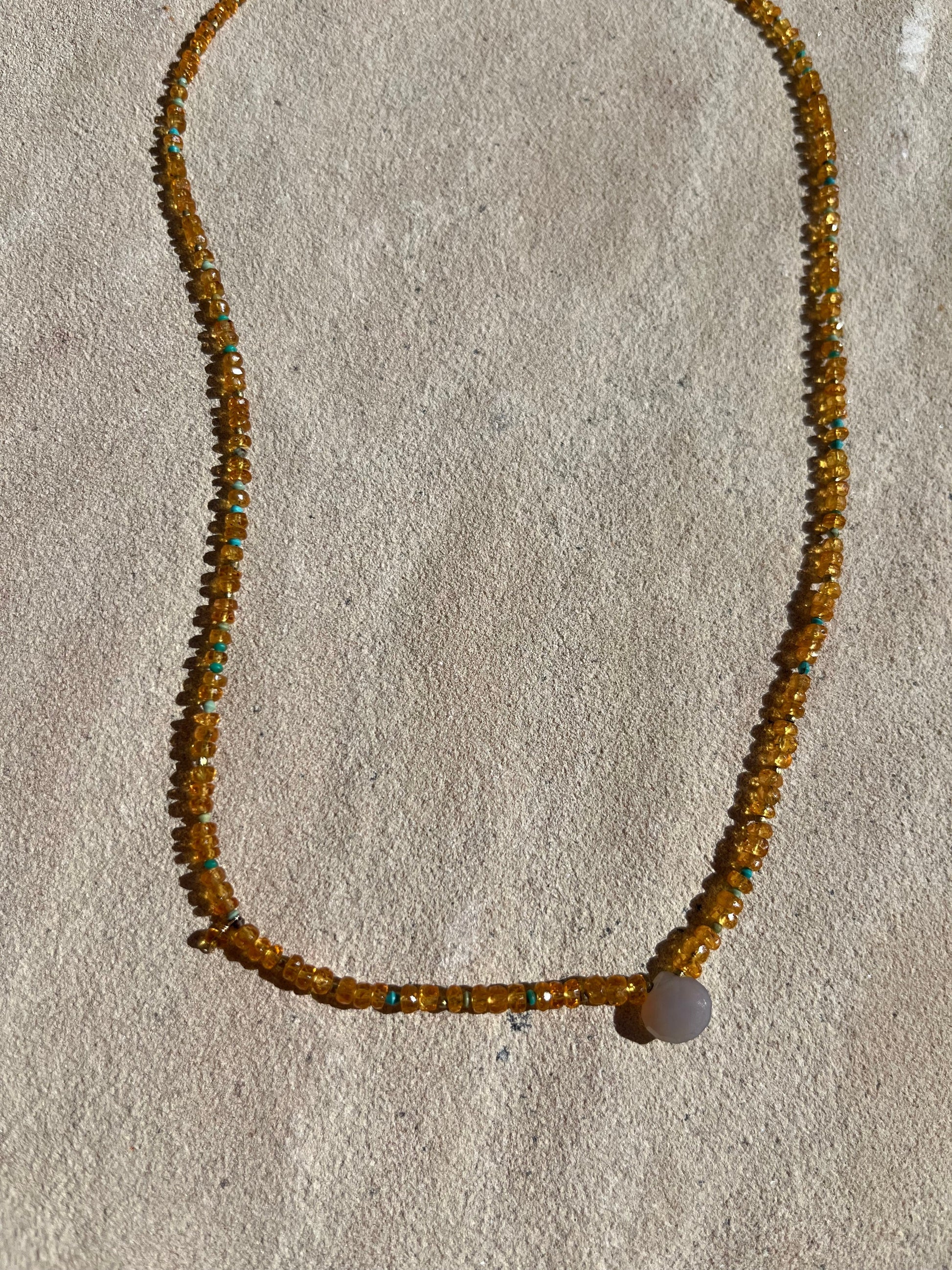 Get your beach-boho-chic vibes on with Coconino. Fanta garnet, chalcedony briolette, hand-wrapped fanta garnet off-center charm, three kinds of turquoise. Off-kilter & akimbo - your inner wild child!