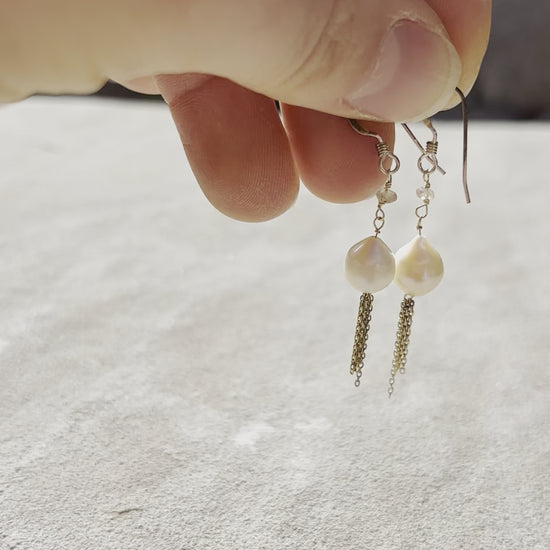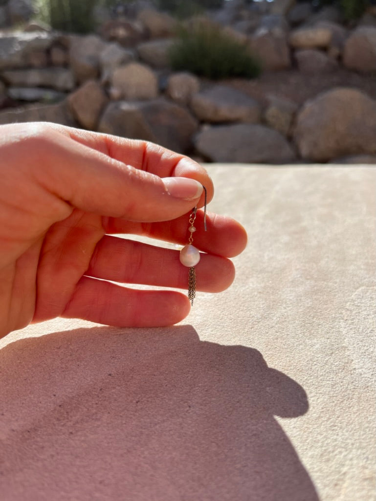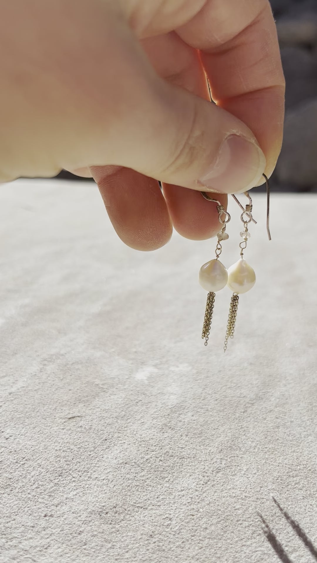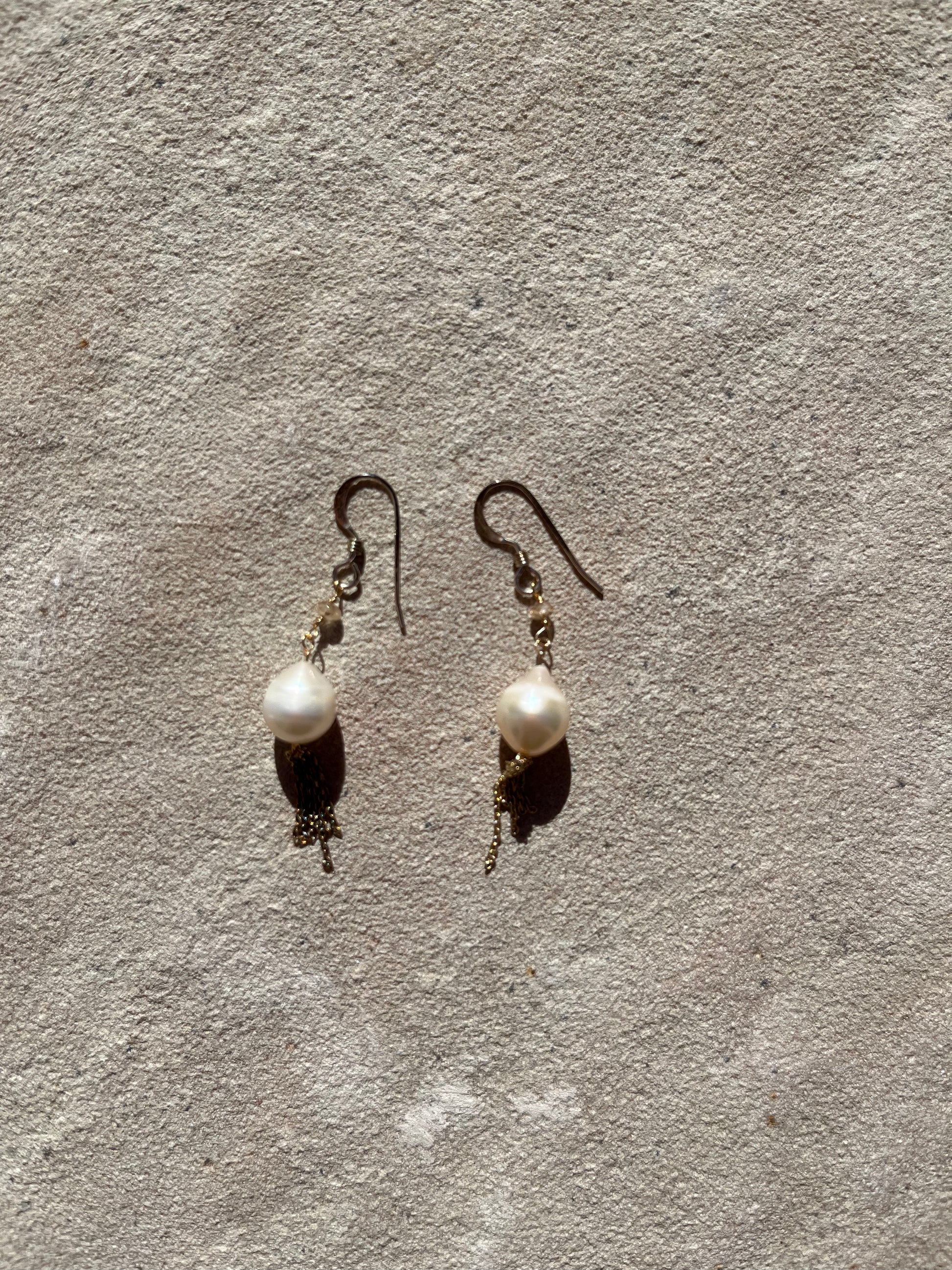Hand-wrapped zircon and luminous teardrop freshwater pearls on gold-filled wire, with sterling silver chains raining down (pluie is French for rain), suspended from sterling silver (925) filled earwires.