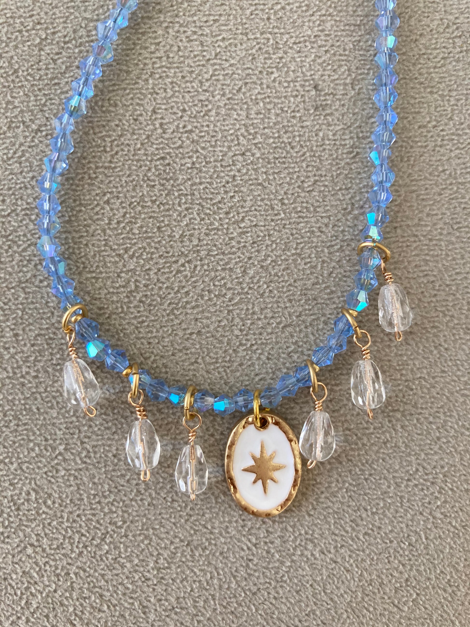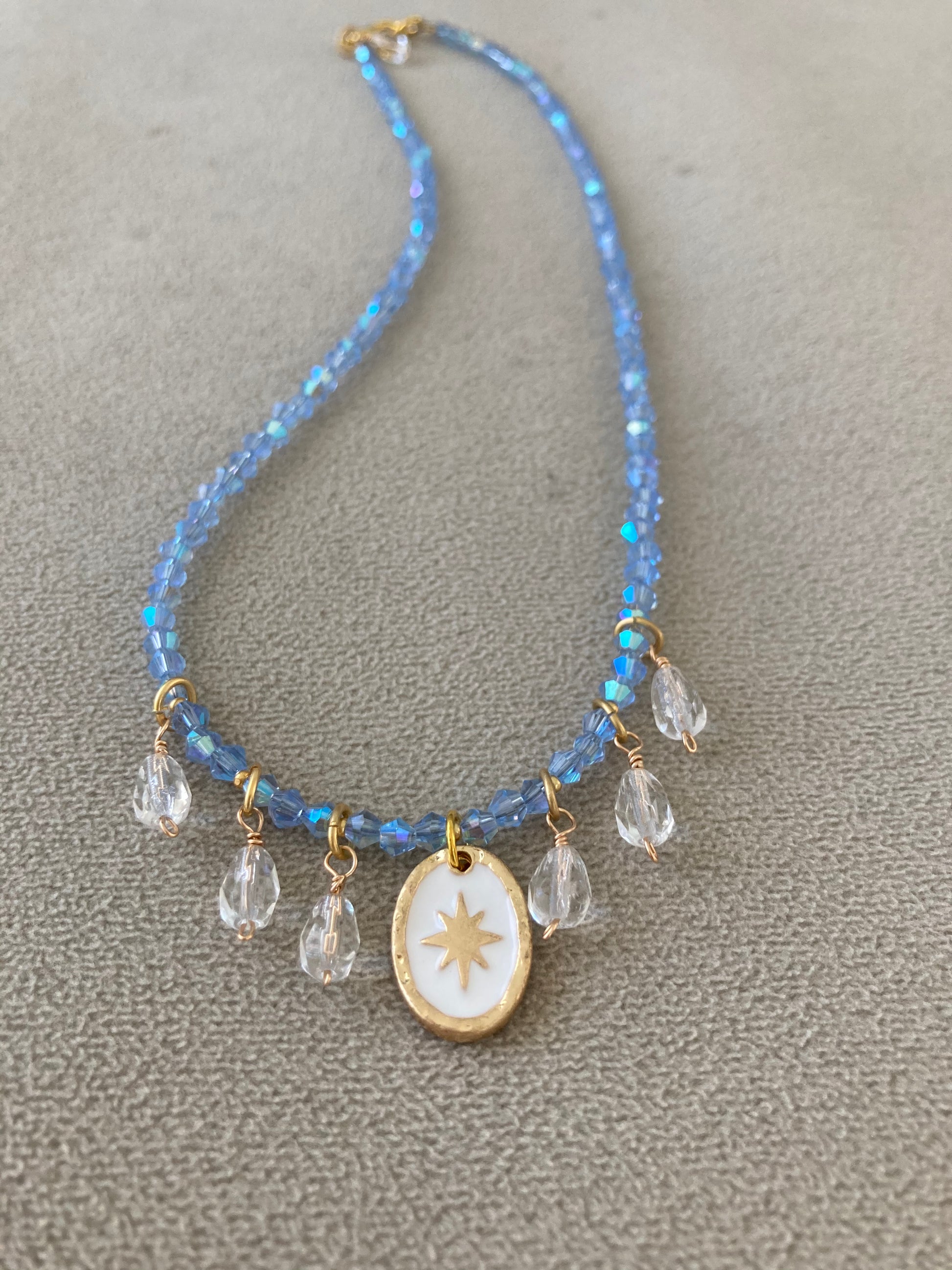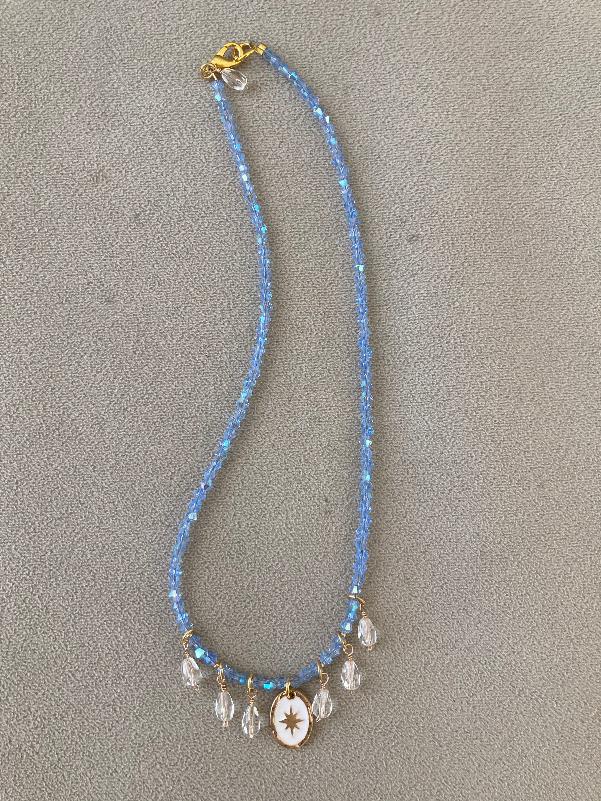 Over time, the metal components may tarnish or fade. To keep them shining, please store your piece in a jewelry pouch or soft cloth, and avoid direct contact with water (shower, bath, hot tub, sweating) as well as beauty products such as perfume.