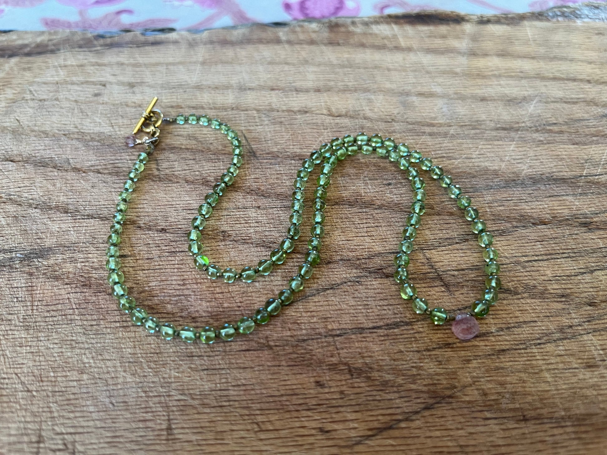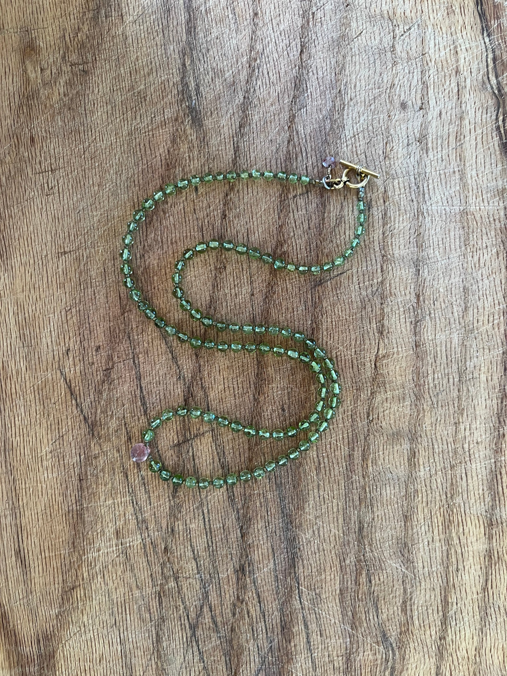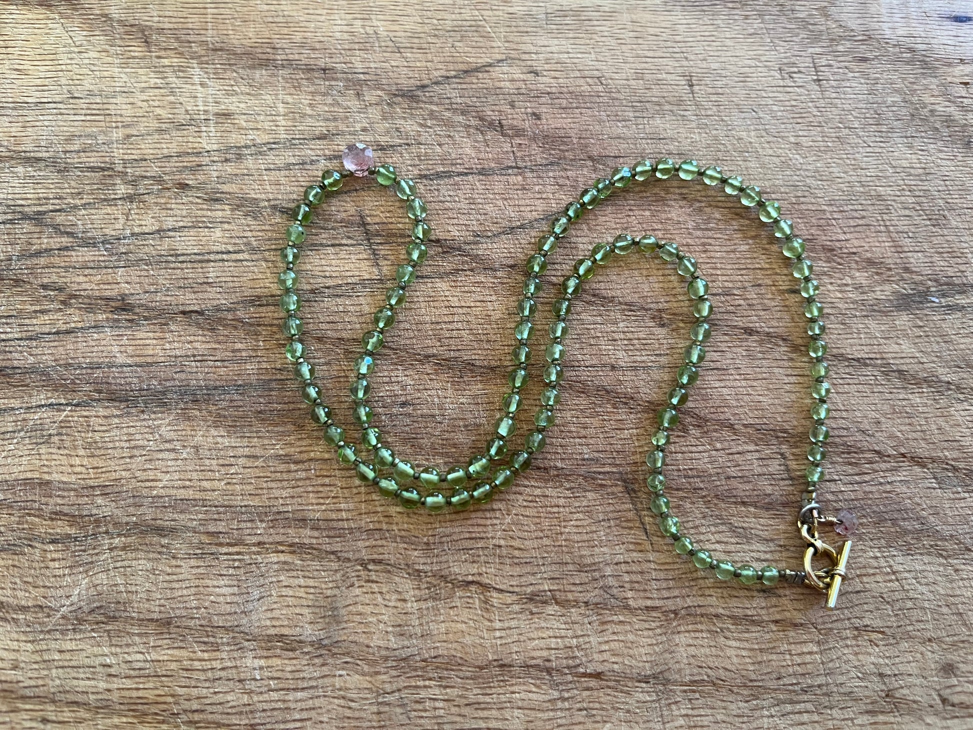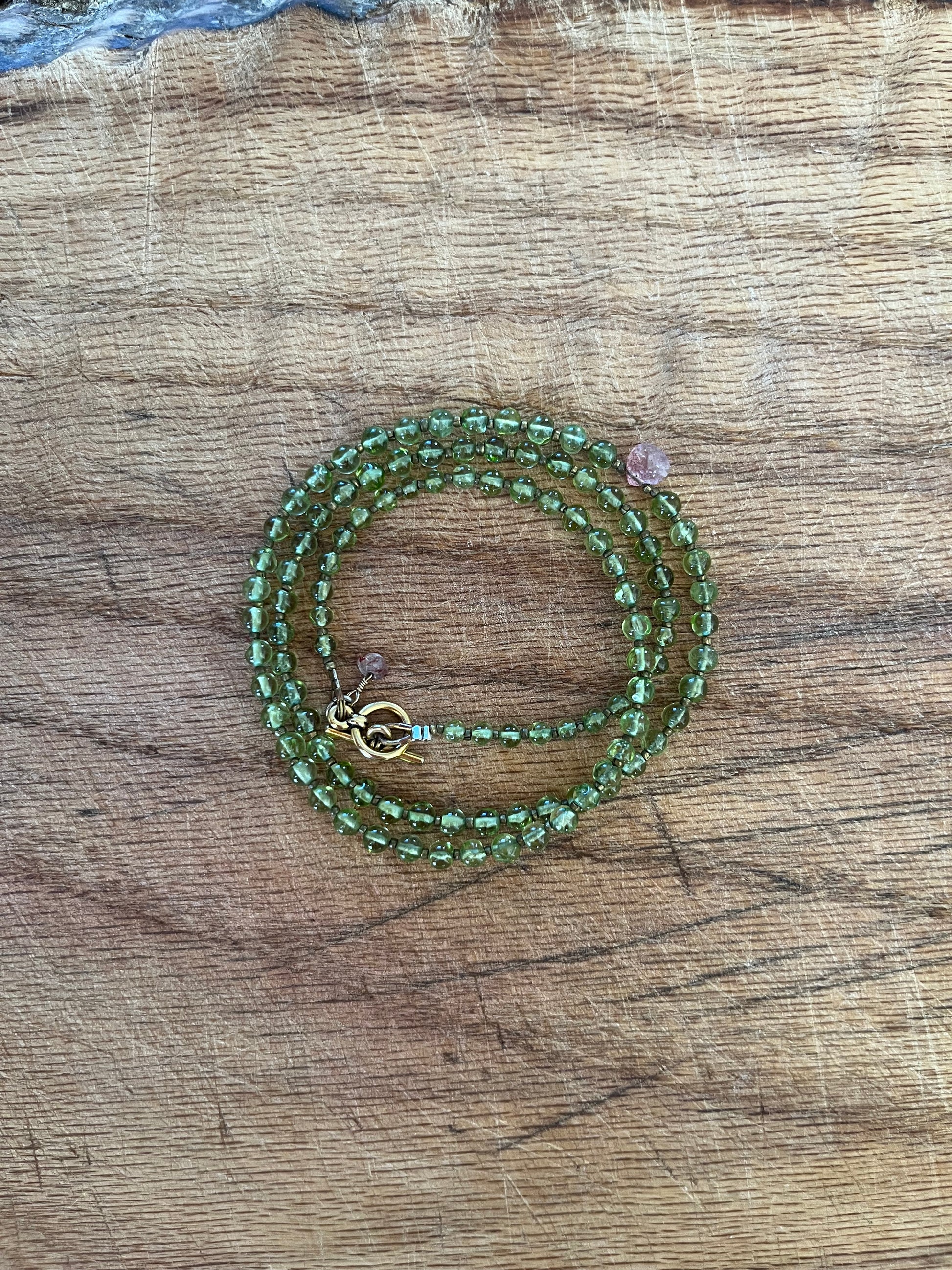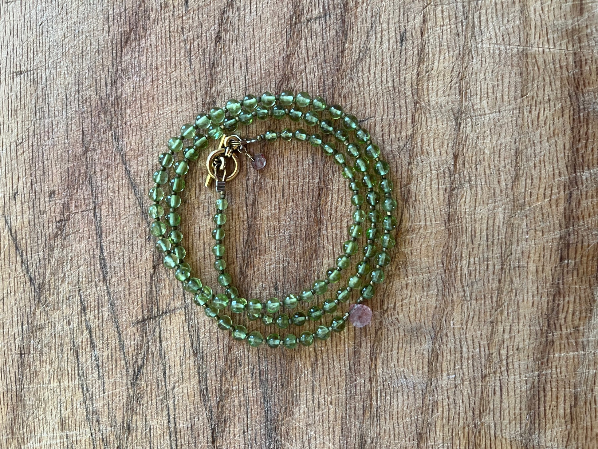 Ah, Demeter - the Ancient Greek goddess of fertility, the harvest, and health in all its forms - bursting forth with verdant green life and little pink buds. Come and get it with this mesmerizing peridot wrap bracelet. It doubles as a necklace, for twice the options! Finished with a strawberry quartz charm and focal briolette, this charmer pairs well with colorful outfits and neutrals alike. Gold plated toggle.