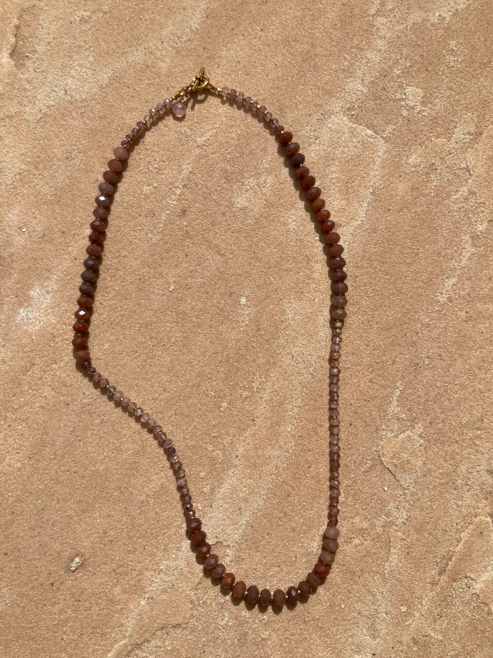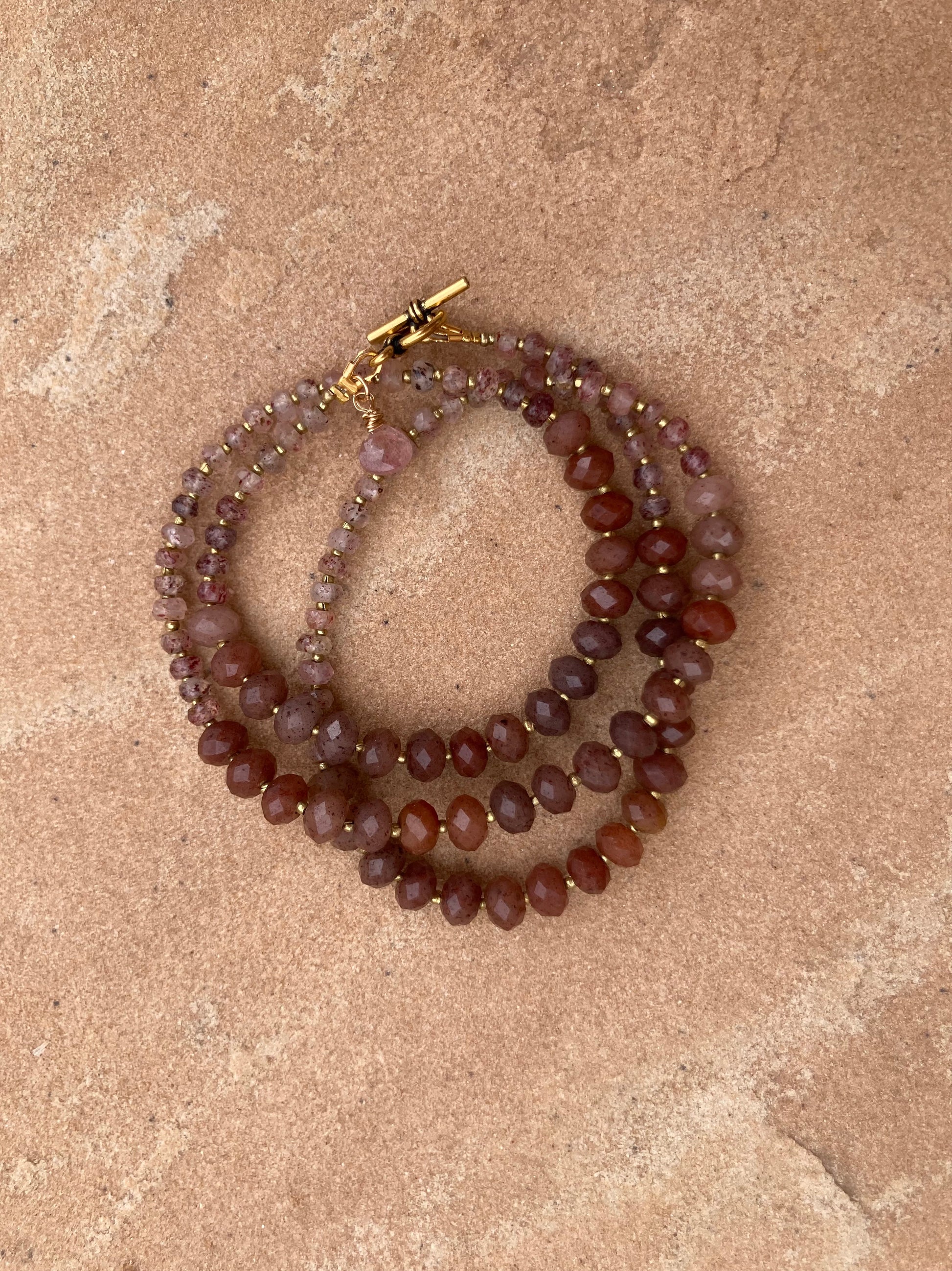This juicy, jammy, bruised strawberry wrap bracelet features purple aventurine and strawberry quartz. Strung with brass beads for movement and sparkle, and finished with a hand-wrapped strawberry quartz briolette and gold plated clasp. Wear it as a wrap bracelet or necklace, add it to your stack or wear it solo!