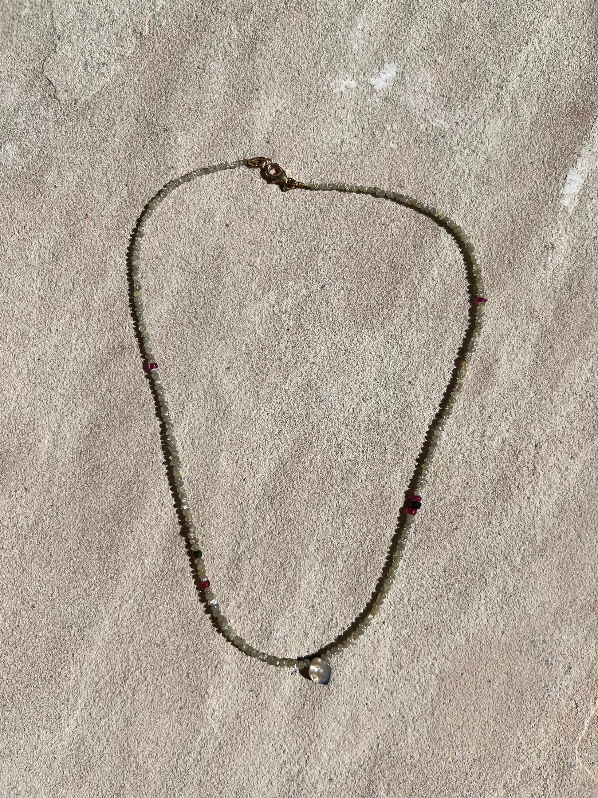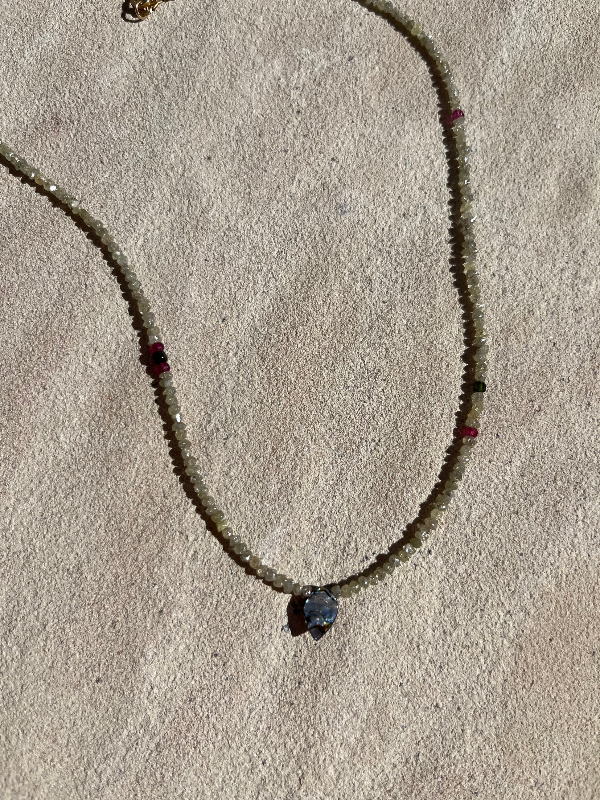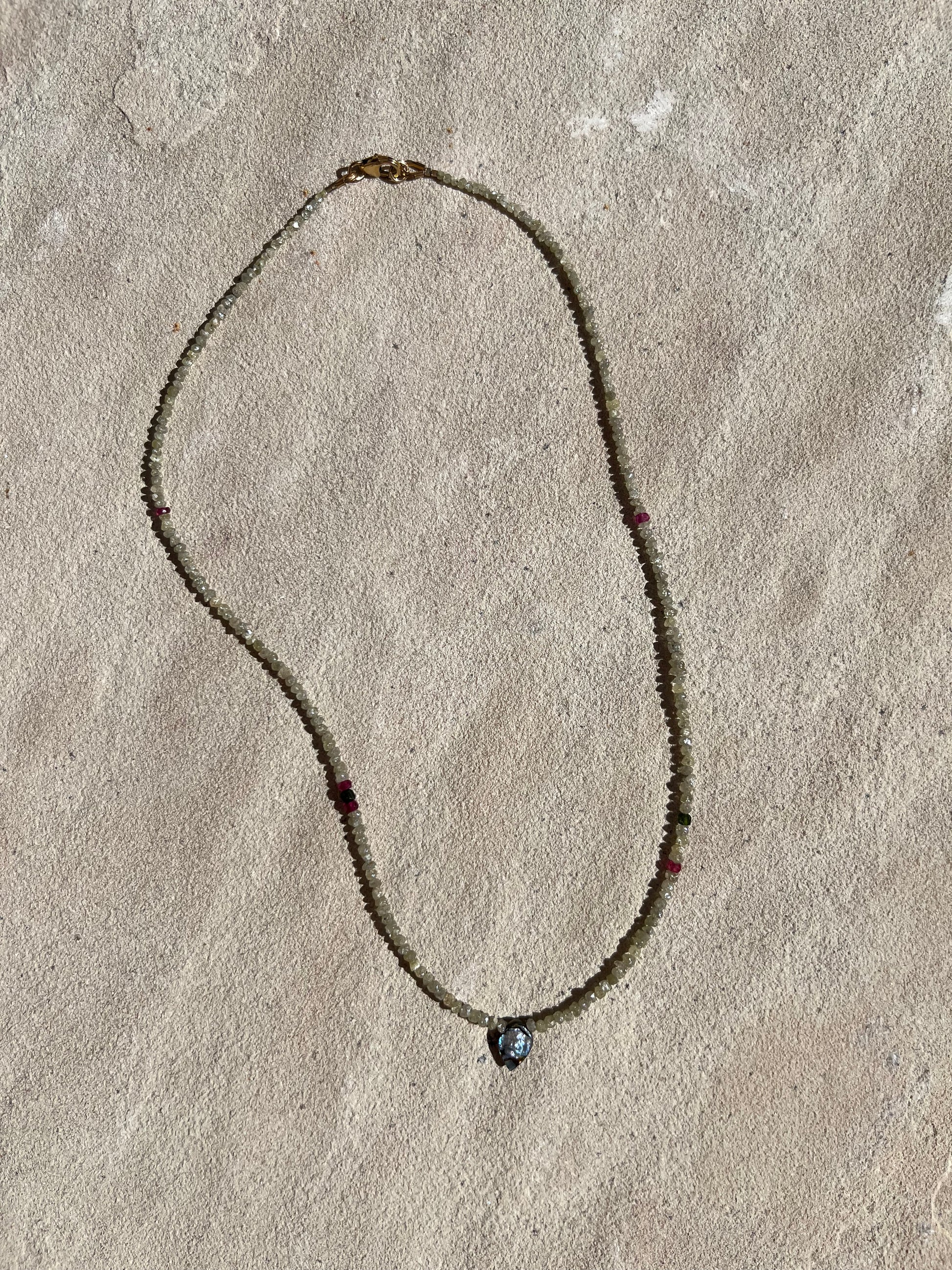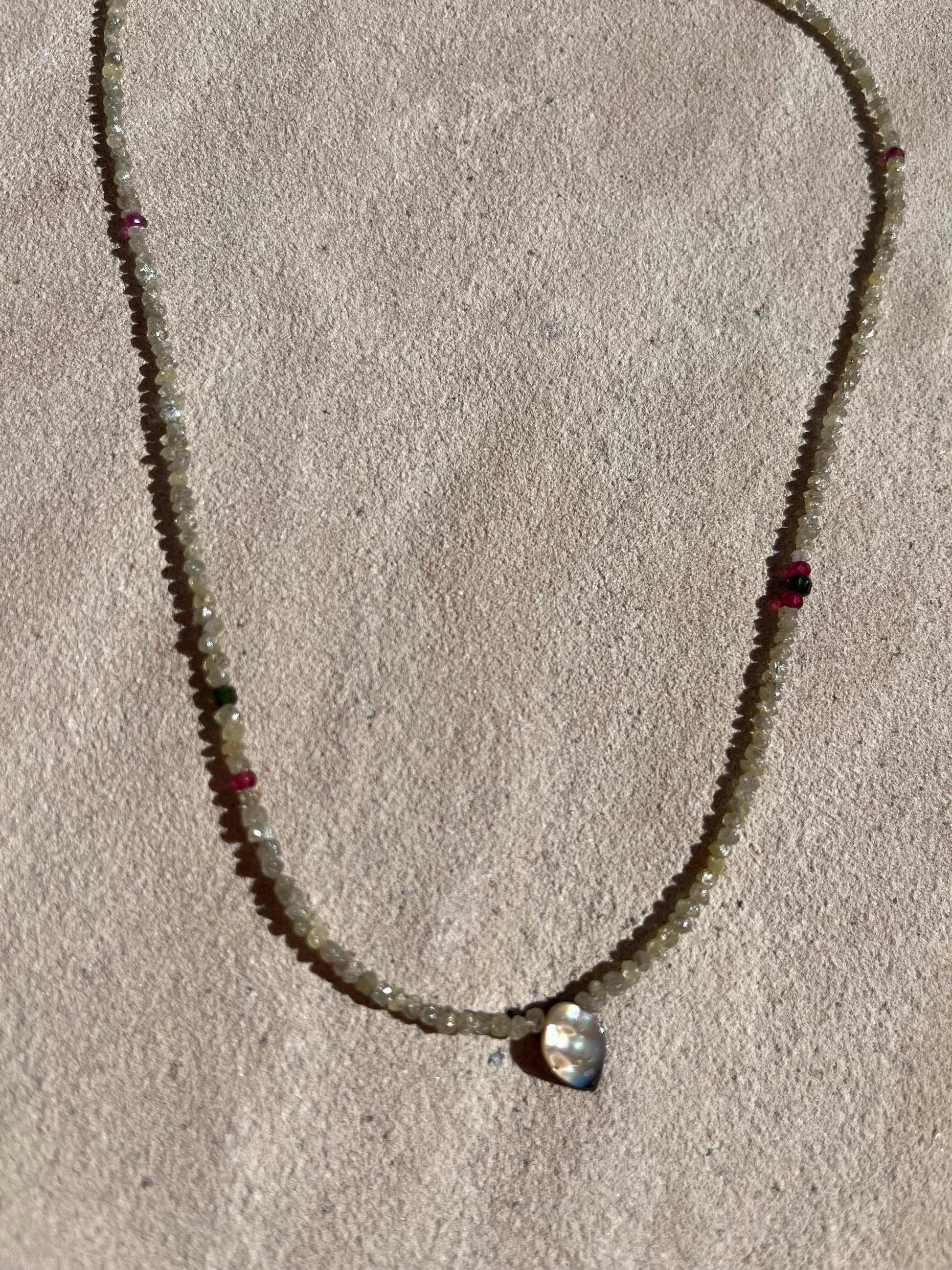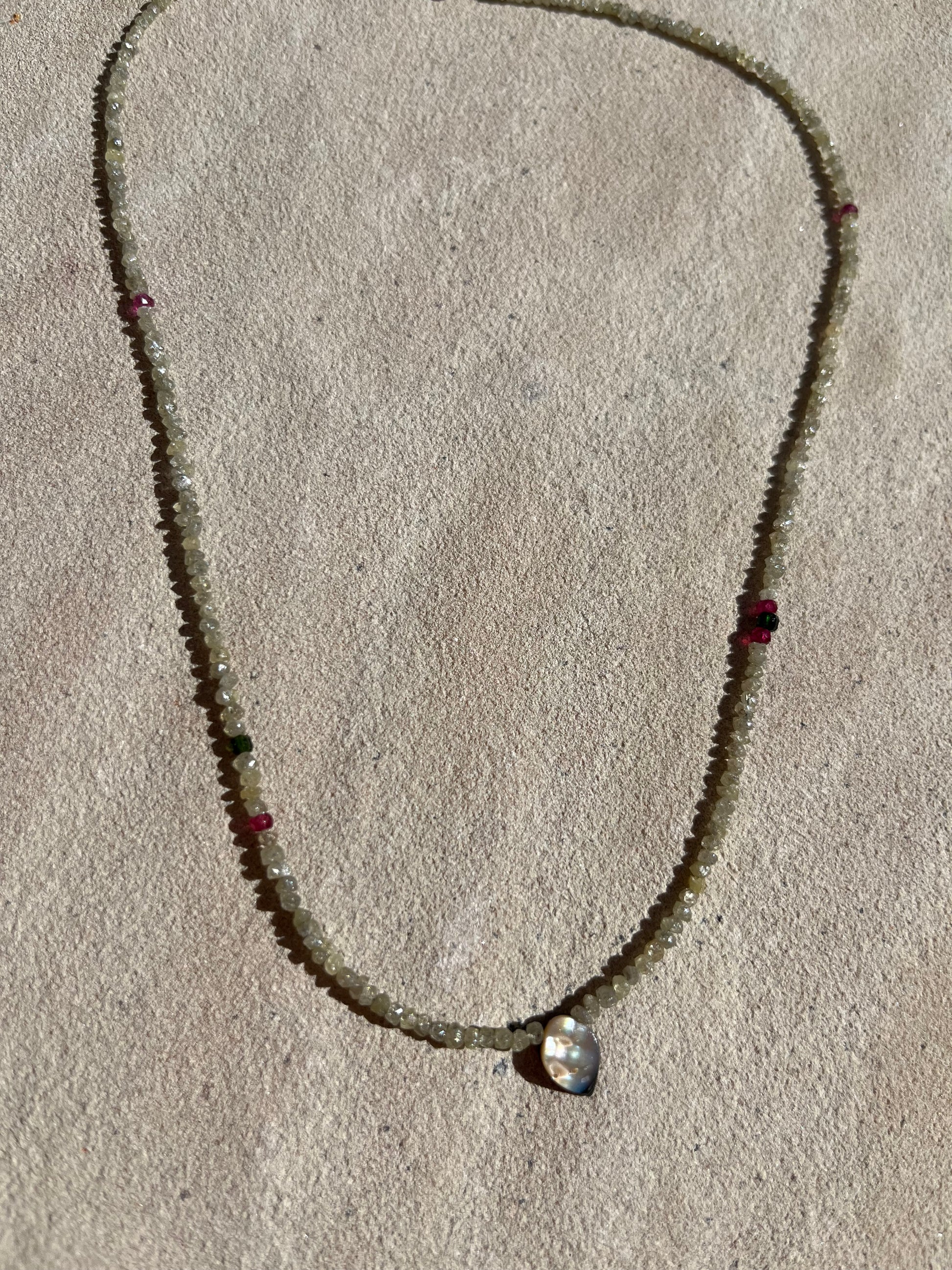 This stunner is made with raw green diamonds, and dusted with ruby and chrome diopside. The focal is a lustrous abalone teardrop. Padma, from Sanskrit, means lotus flower -- the lotus is a symbol of purity, rebirth, and the divine because it rises from the dark mud to become a breathtakingly gorgeous bloom. And, this necklace will make you feel as though you are reborn in beauty! At once simple and ornate, this will pair well with any necklace stack, and can be dressed up or down as you wish.