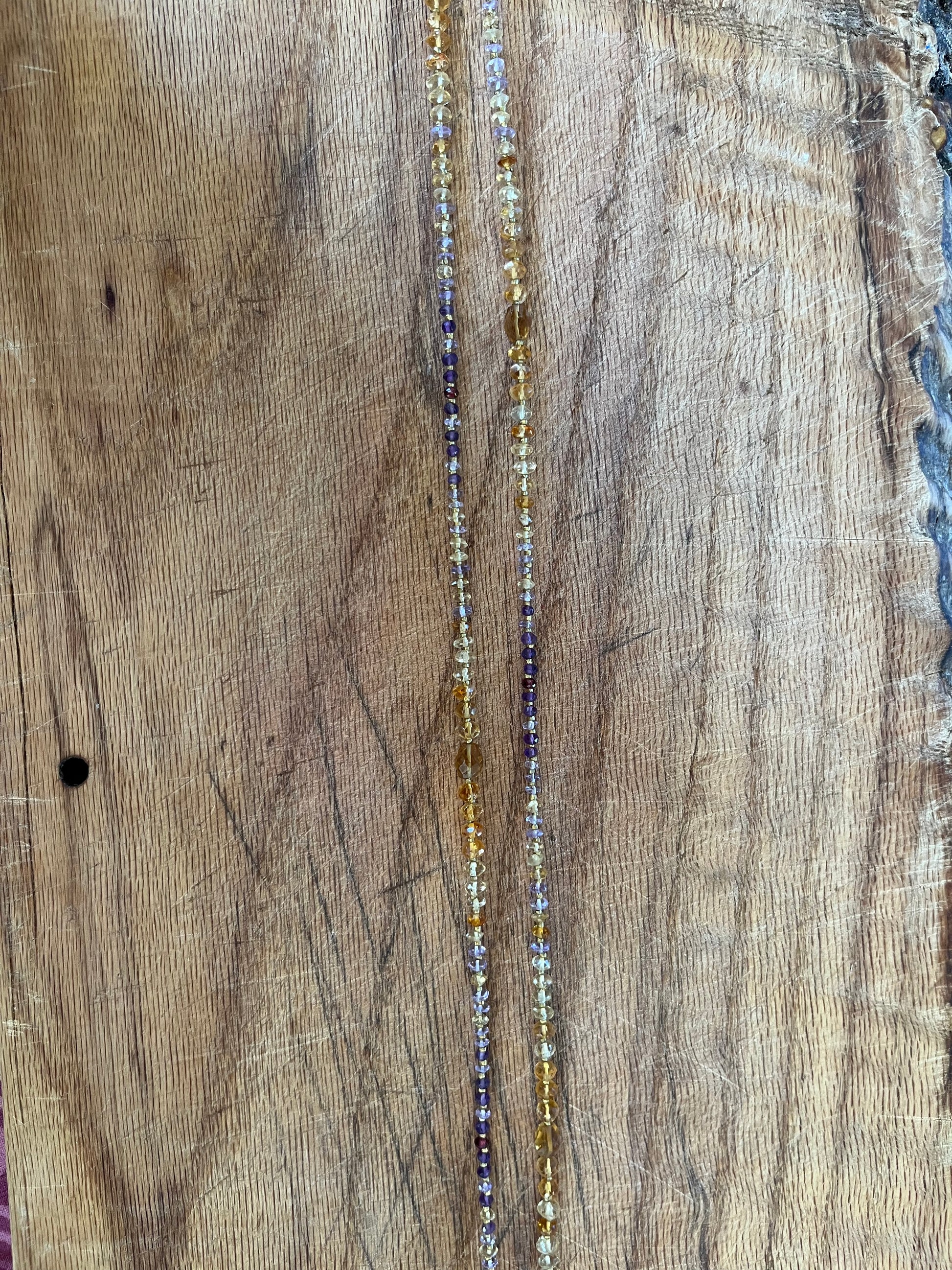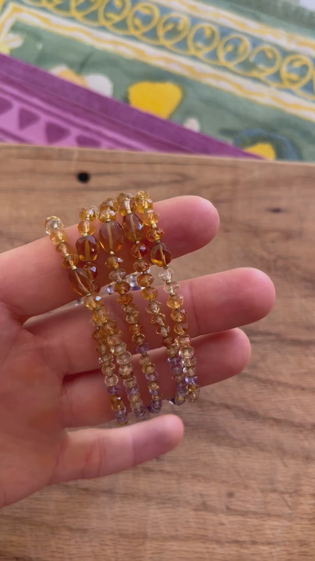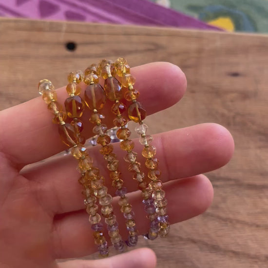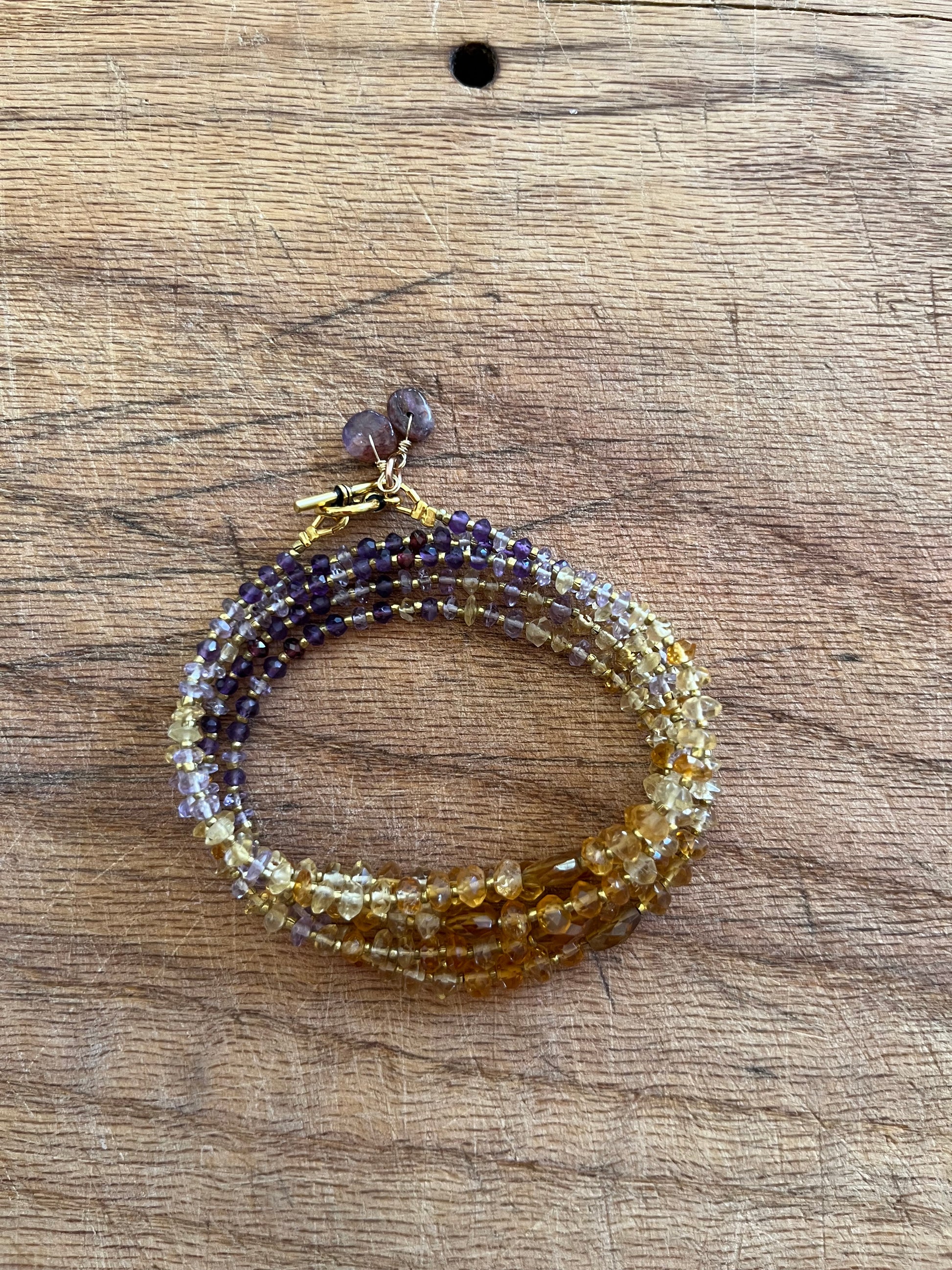 Named after the phoenix, a legendary firebird that is reborn from its own ashes. This striking wrap bracelet is made from citrine, amethyst, and purple garnet faceted beads, interspersed with hammered Ethiopian mixed metal beads. Hand selected for both size and color gradient, ranging from smaller light amethyst and dark purple garnet to larger citrine, and centering with a large rectangle cut citrine bead. The gradients will align when wrapped five times around the wrist, but also looks stunning worn as an opera necklace. Finished with hand-wrapped super 7 charms and a gold plated toggle clasp.