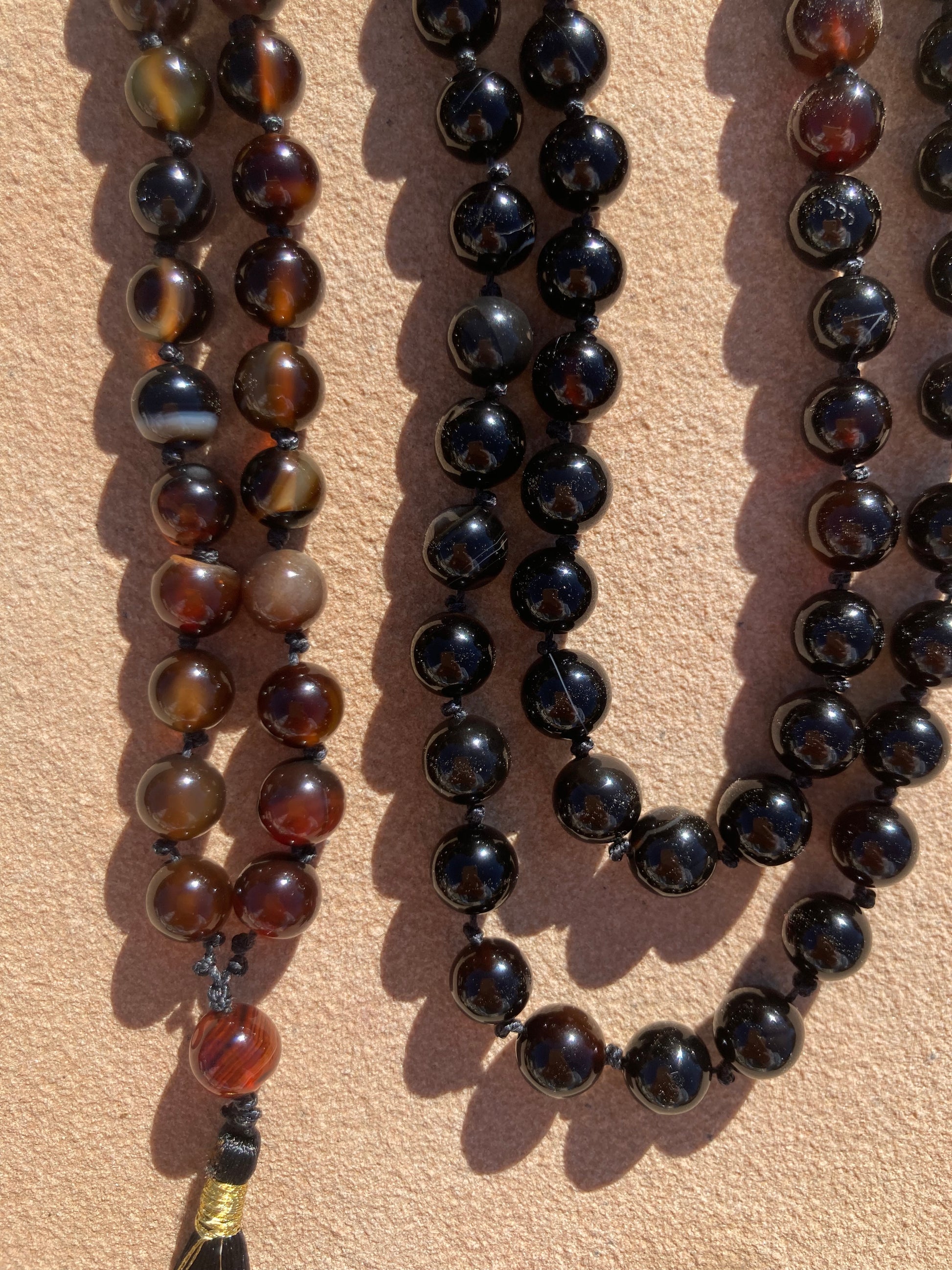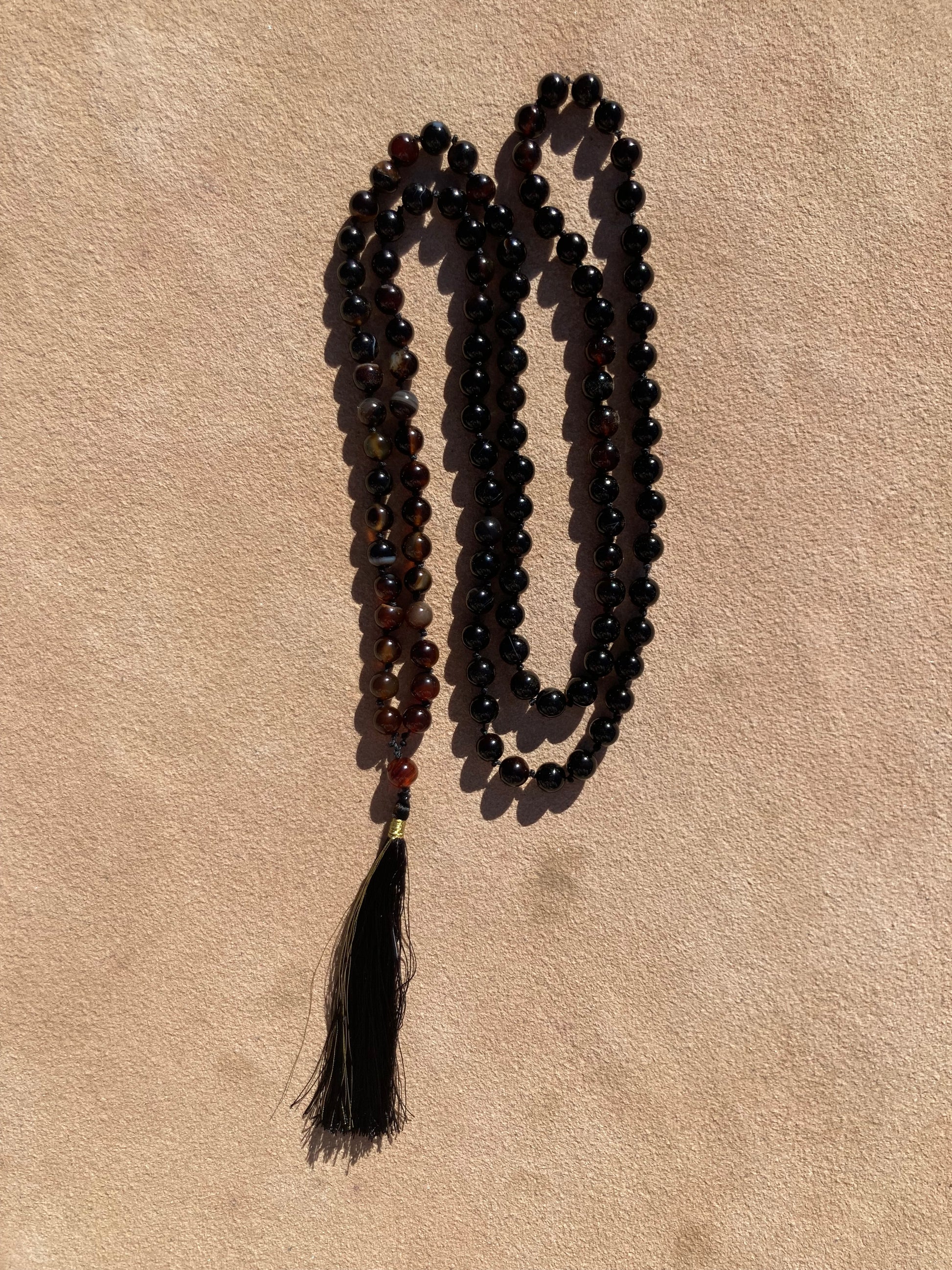 Named for the rich black hue of its stones and tassel, the Raven mala is designed to guide your journey inward, improving your abilities of self-perception and supporting the discovery of truth during your spiritual reflections. Gorgeous polished 11mm agate rounds, hand selected for a gradient from deepest black to a just-barely translucent brown, and finished with a silk black tassel resembling a raven's feather. Hand-knotted on pitch black thread for beautiful drape. Measuring 24 1/2" including the 9cm silk tassel, and 20 1/4" on the inside (excluding guru bead and tassel).