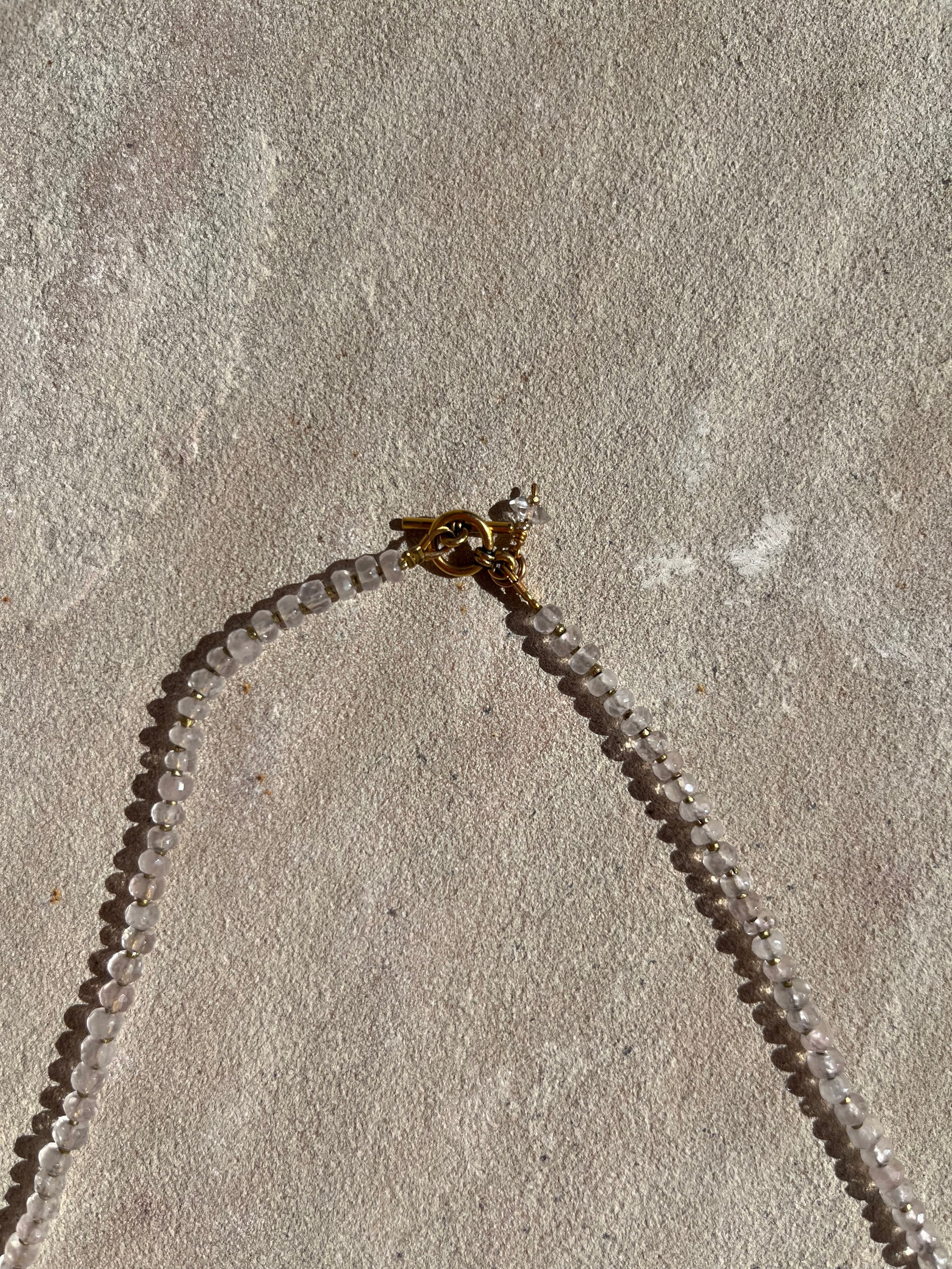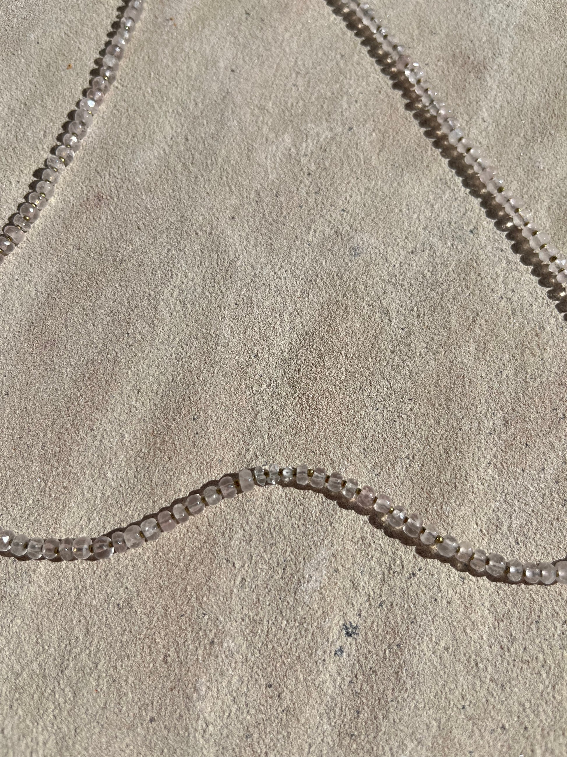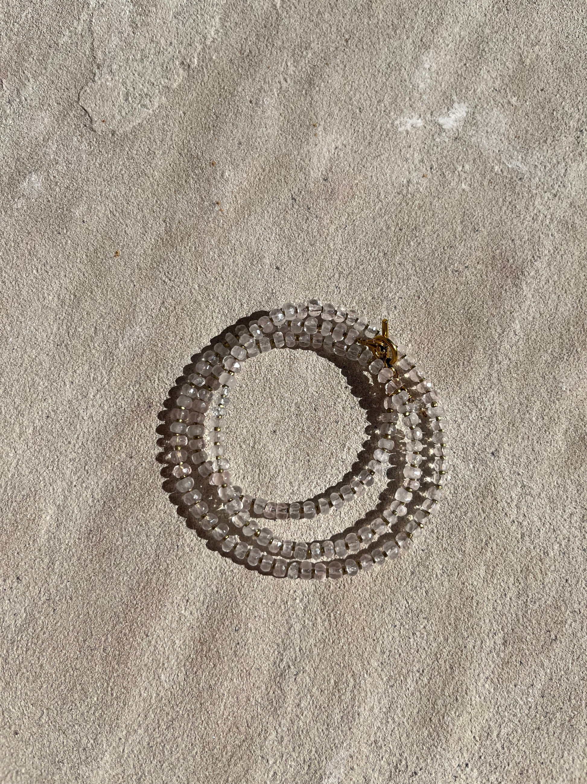 This effervescent pink wrap will brighten up your day and turn it into a vacation, from morning coffee time, to beach, to BBQ, to evening soiree. Petal soft rose quartz with three sparkling herkimer diamonds at the center.