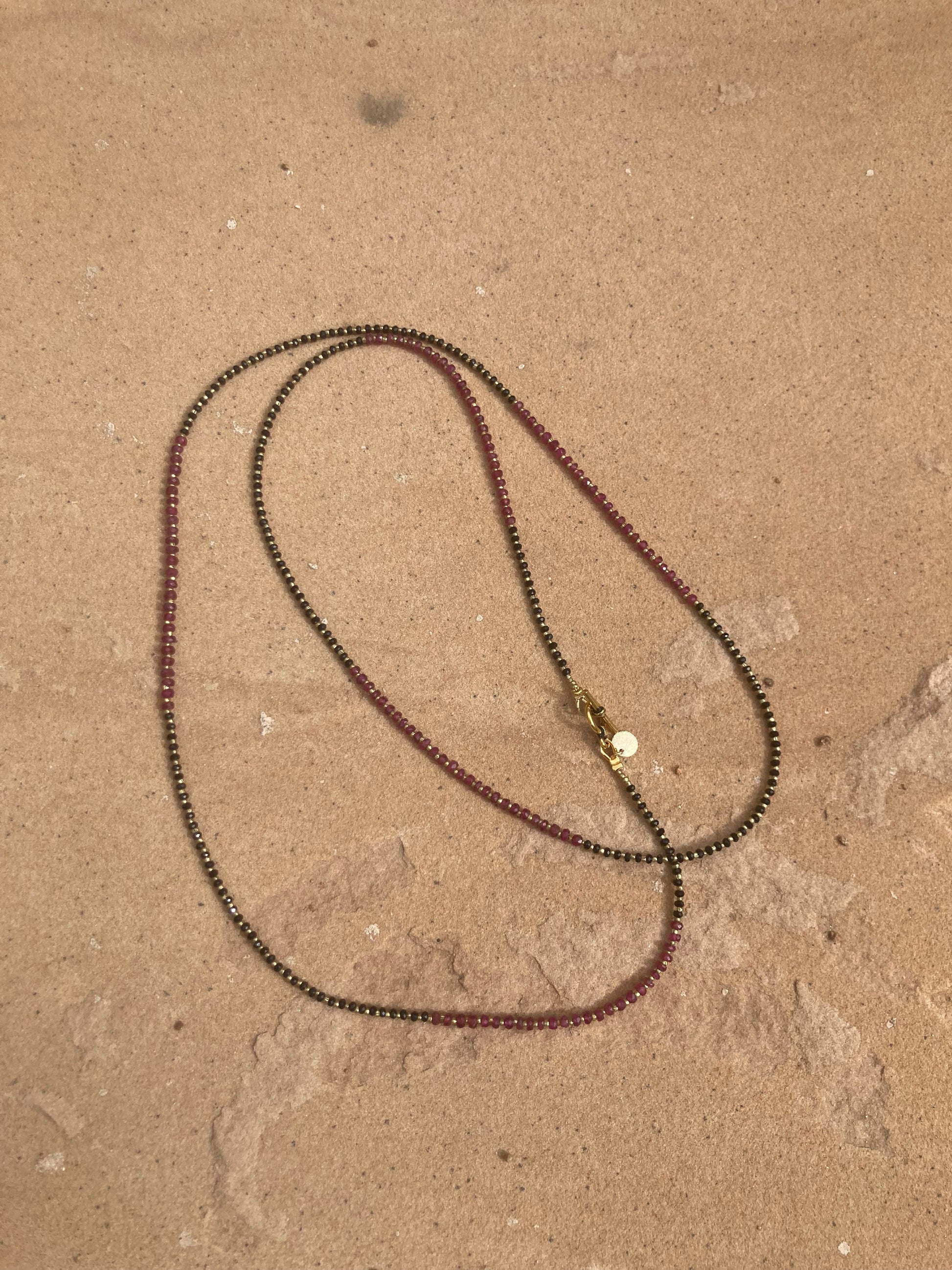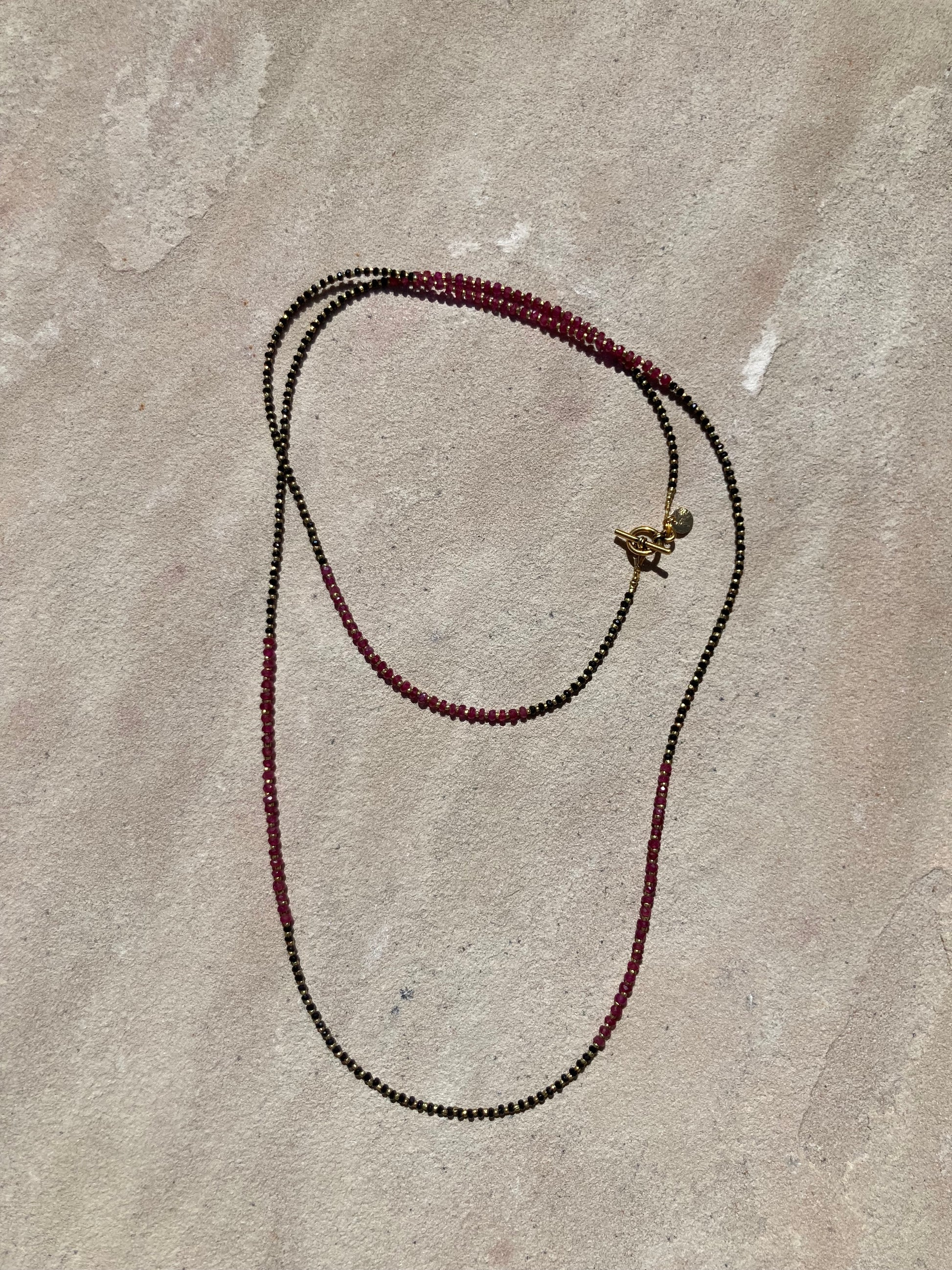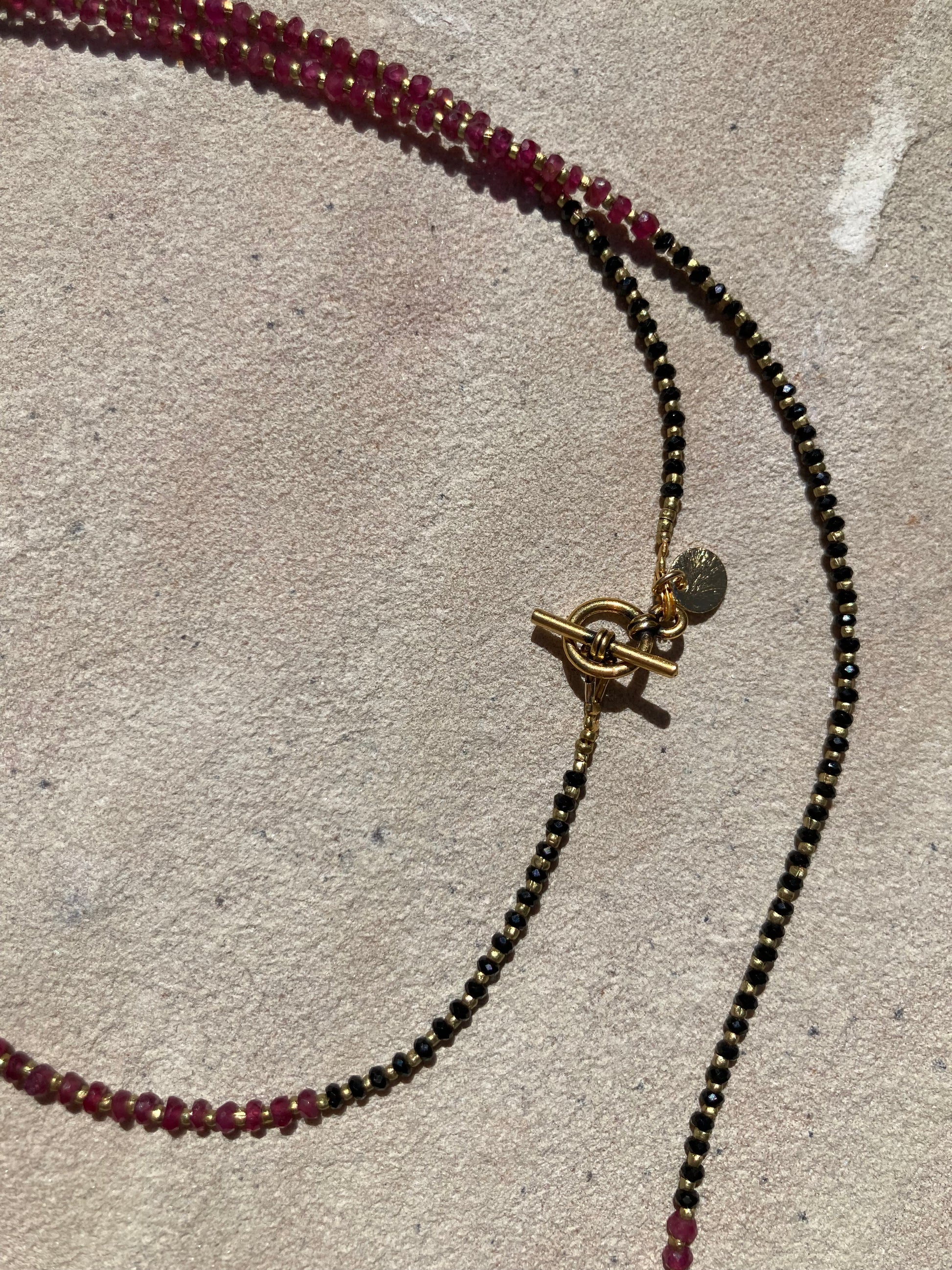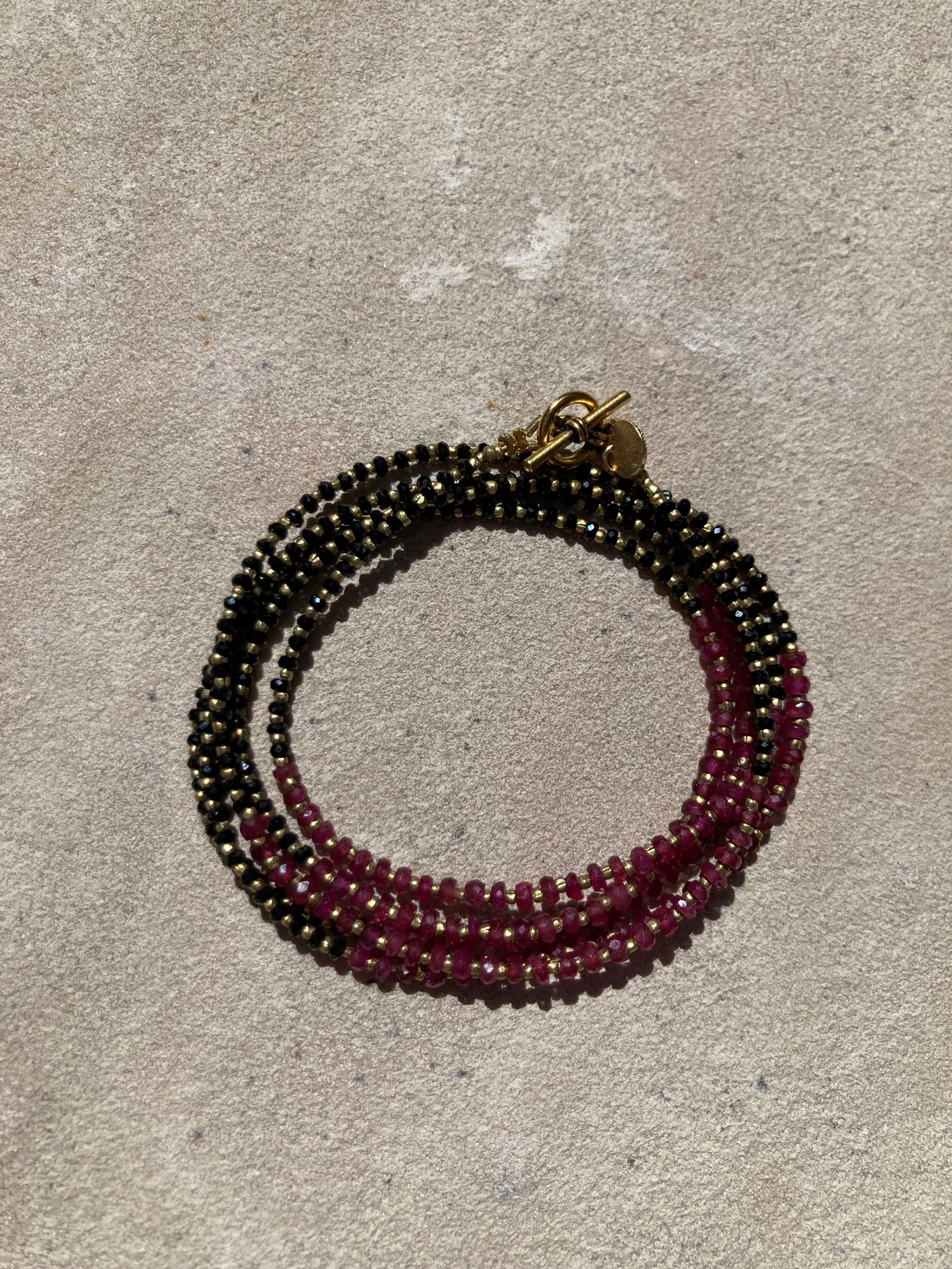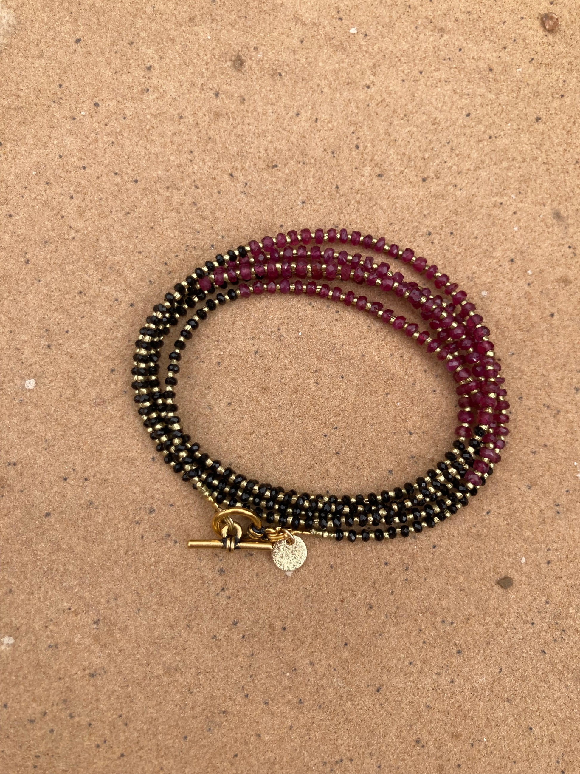 Delicate yet rock-n-roll, the Surfer Rosa is an instant classic. Tiny rubies and black spinel are strung with brass beads, enhancing their sparkle and lending movement and drape to this piece. Finished with a tiny brushed brass charm and a gold plated clasp. Wear it as a wrap bracelet or necklace, add it to your stack or wear it solo!