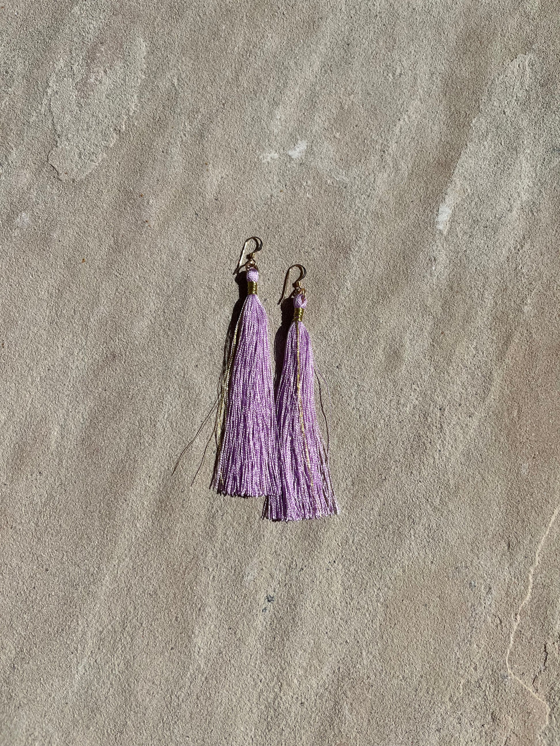 Luscious 9 cm real silk tassels in color Aster, on gold filled earwires. Tassels have been used in jewelry since ancient Egypt - get some!