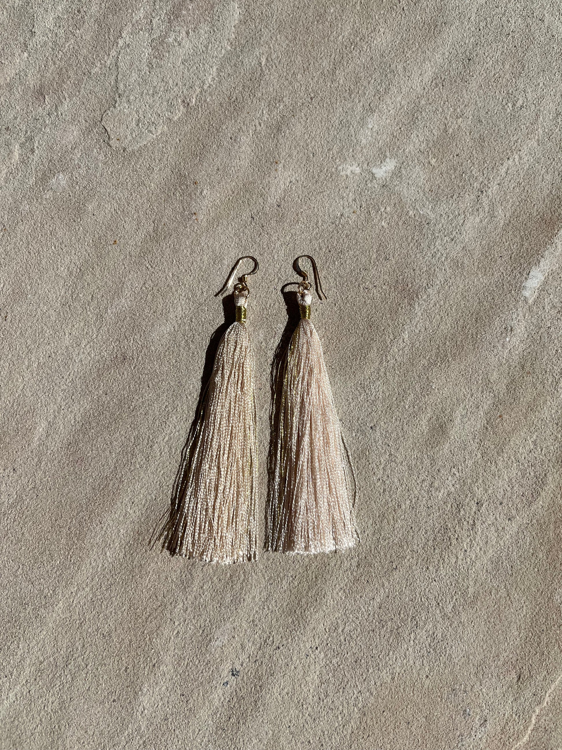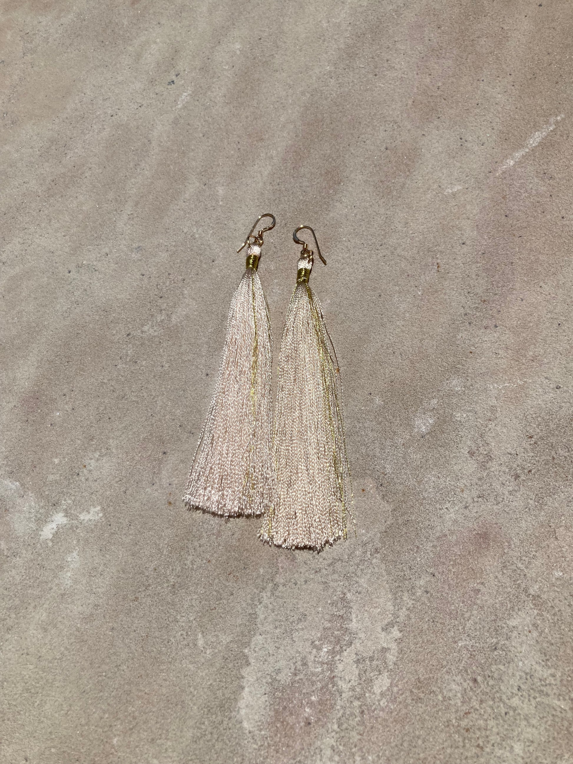 Luscious 9 cm real silk tassels in color Sugar, on gold filled earwires. Tassels have been used in jewelry since ancient Egypt - get some!