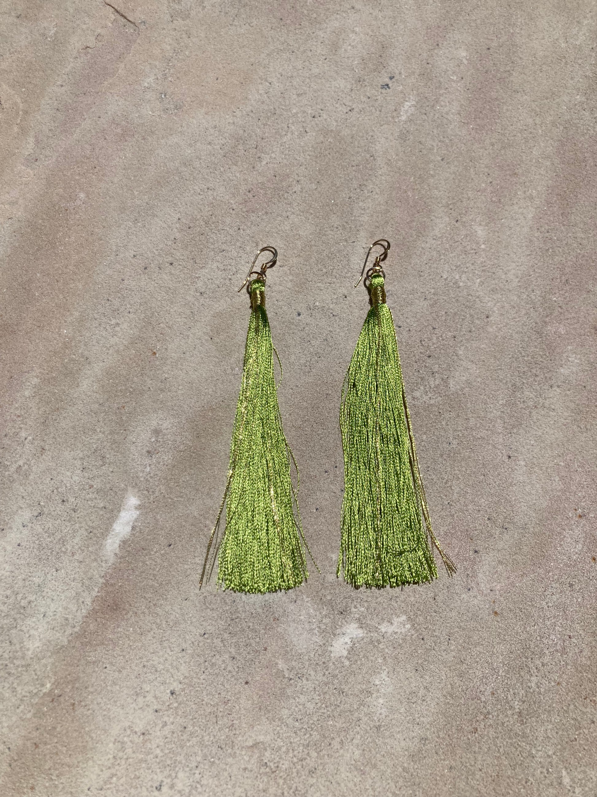 Luscious 9 cm real silk tassels in color Frond (warmer light green), on gold filled earwires. Tassels have been used in jewelry since ancient Egypt - get some!