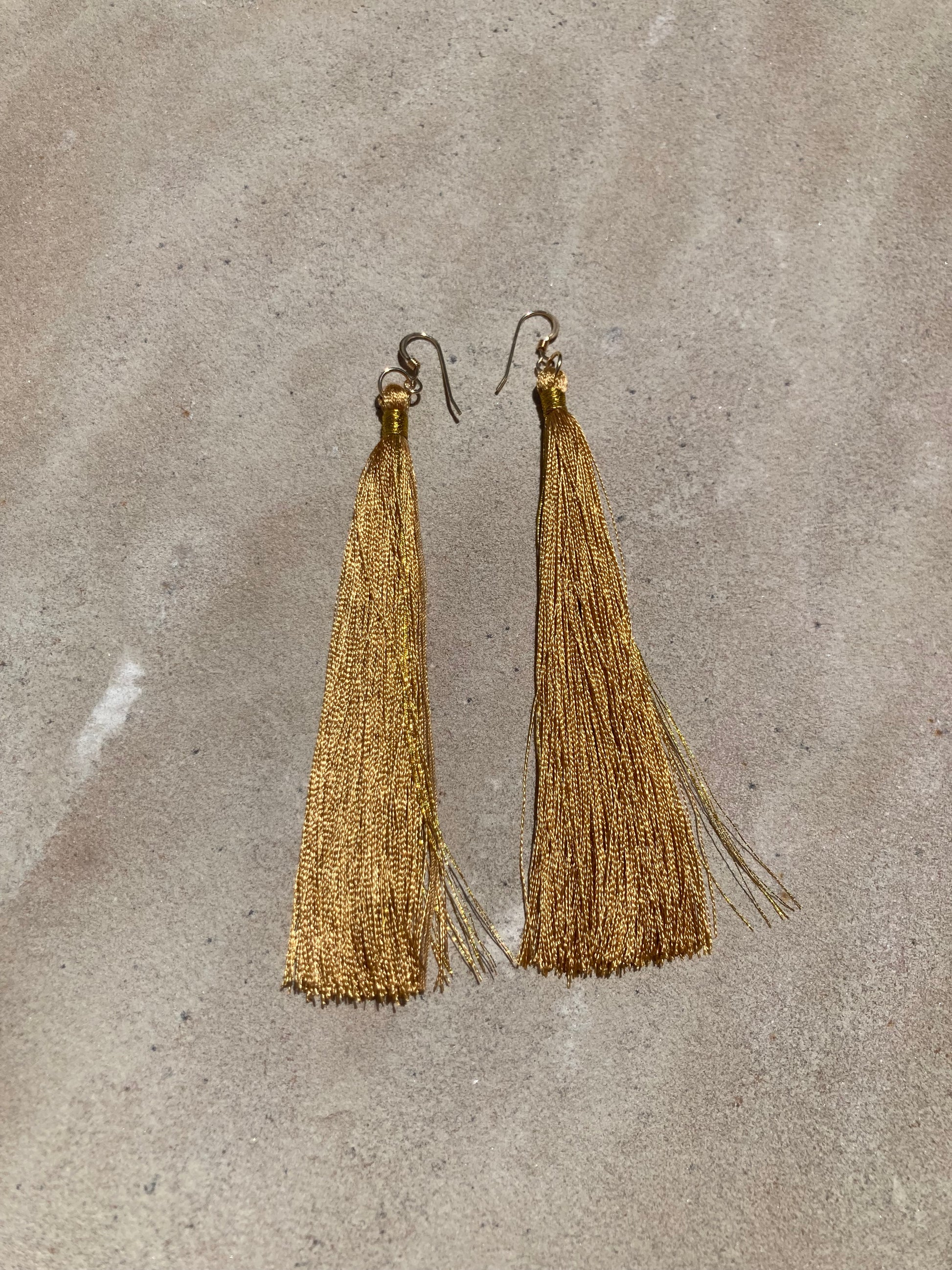 Luscious 9 cm real silk tassels in color Gold, on gold filled earwires. Tassels have been used in jewelry since ancient Egypt - get some!