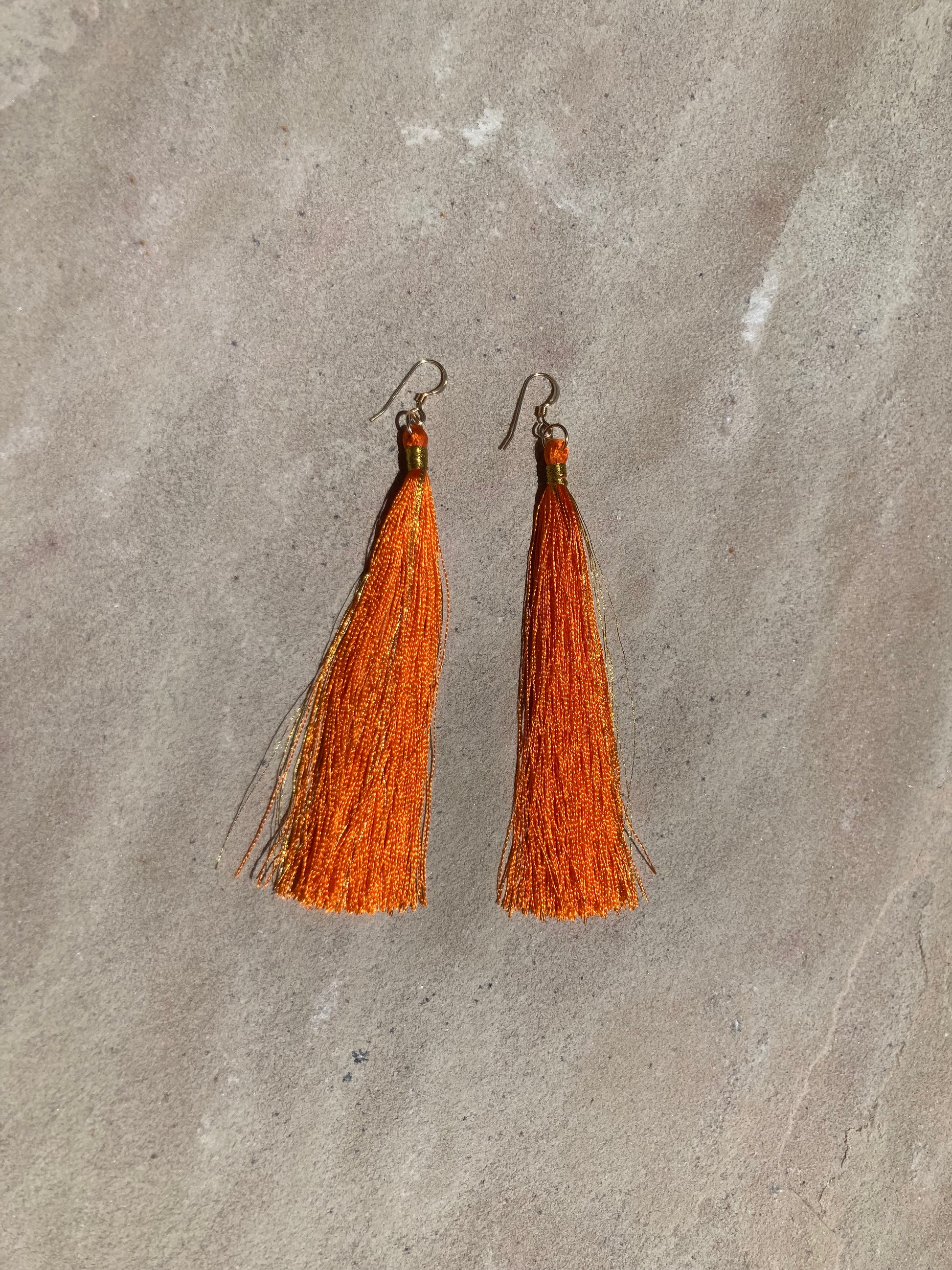 Luscious 9 cm real silk tassels in color Holi Orange, on gold filled earwires. Tassels have been used in jewelry since ancient Egypt - get some!