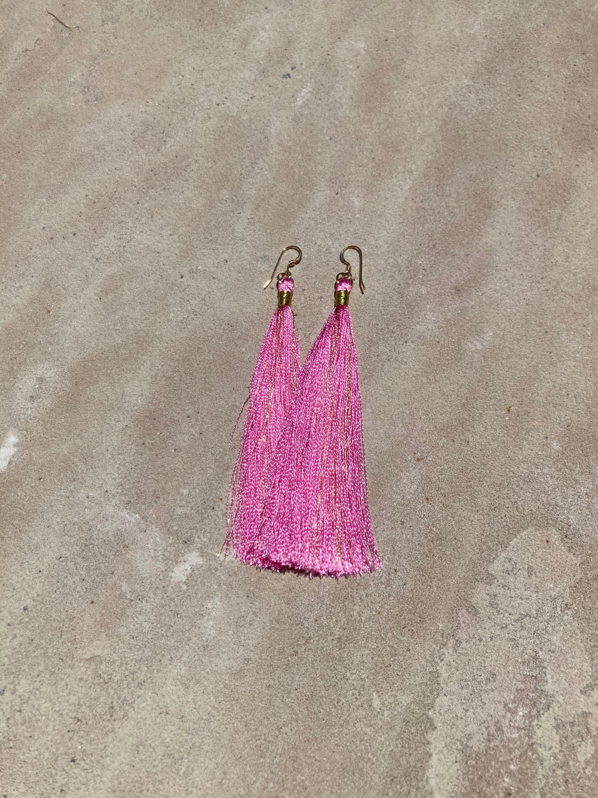 Luscious 9 cm real silk tassels in color Holi Pink, on gold filled earwires. Tassels have been used in jewelry since ancient Egypt - get some!