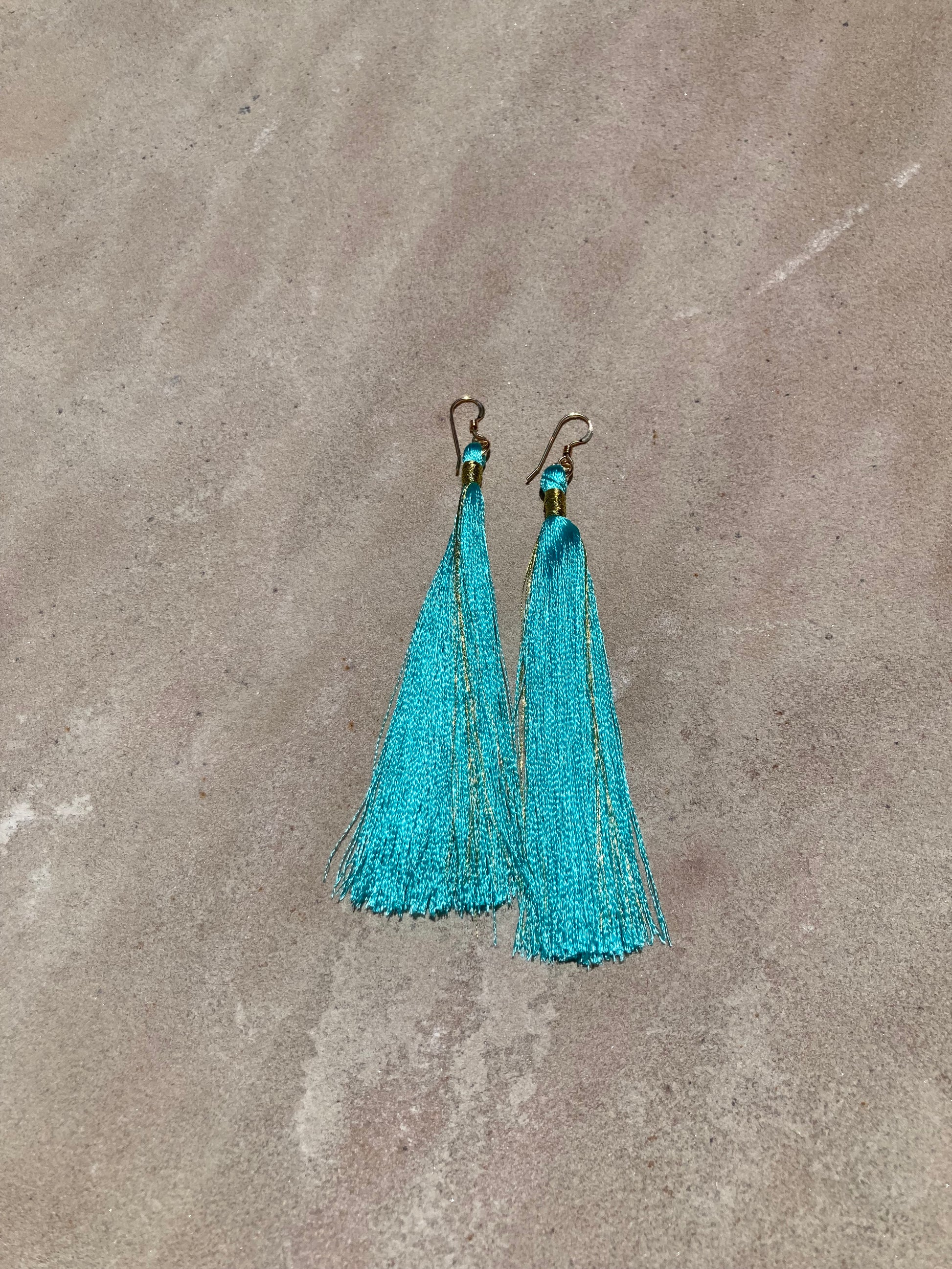 Luscious 9 cm real silk tassels in color Ocean, on gold filled earwires. Tassels have been used in jewelry since ancient Egypt - get some!