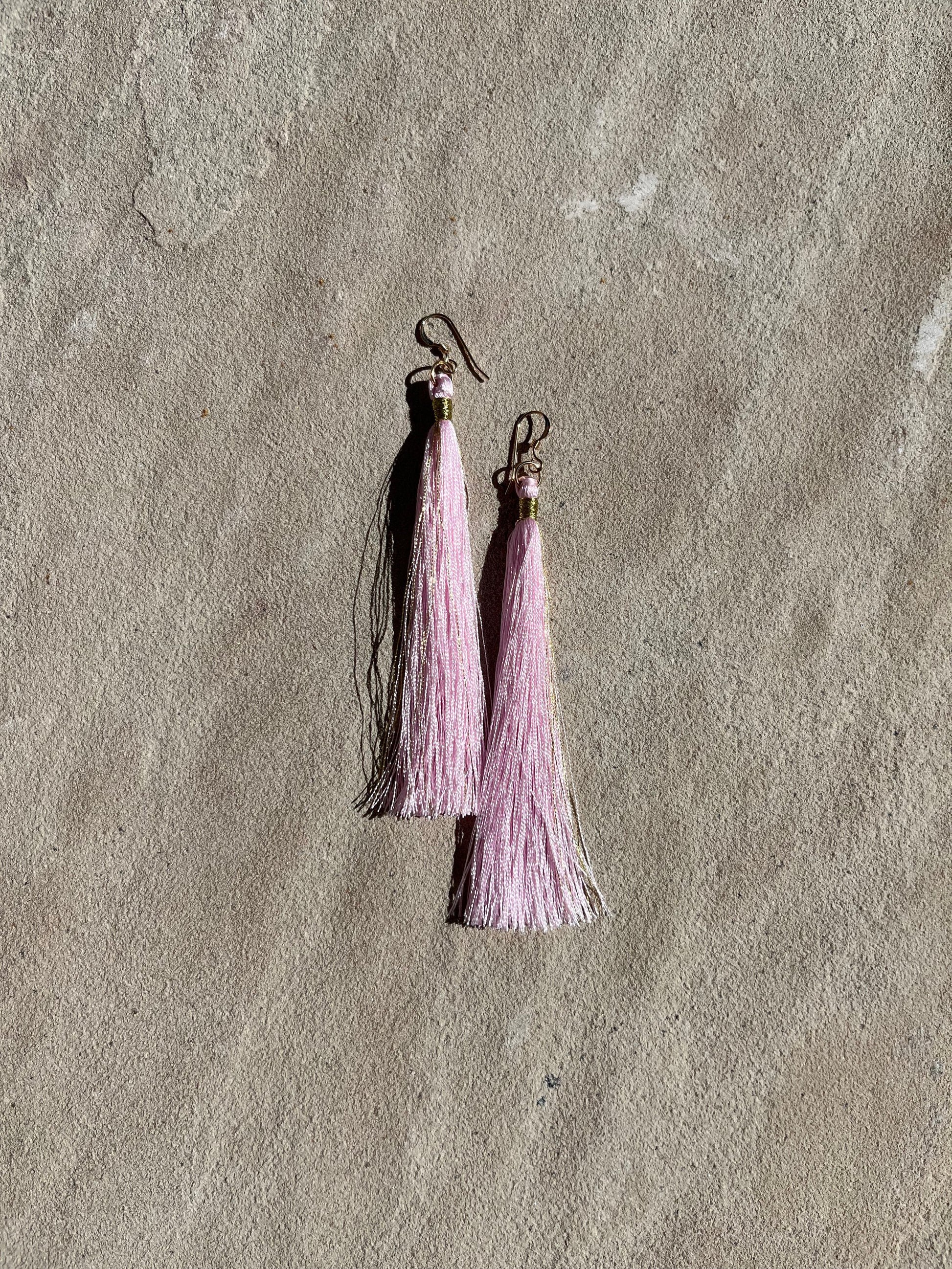 Luscious 9 cm real silk tassels in color Sakura, on gold filled earwires. Tassels have been used in jewelry since ancient Egypt - get some!