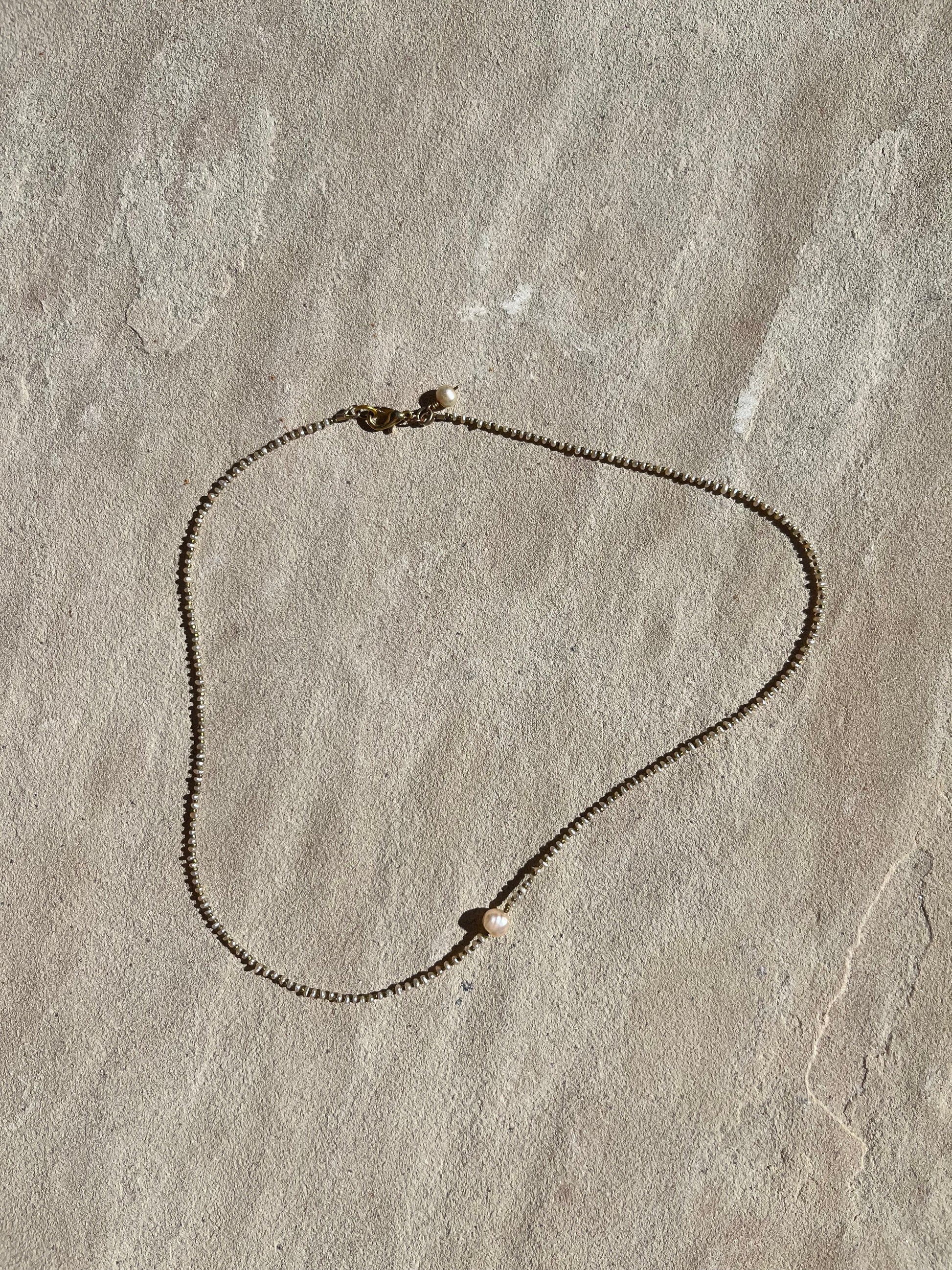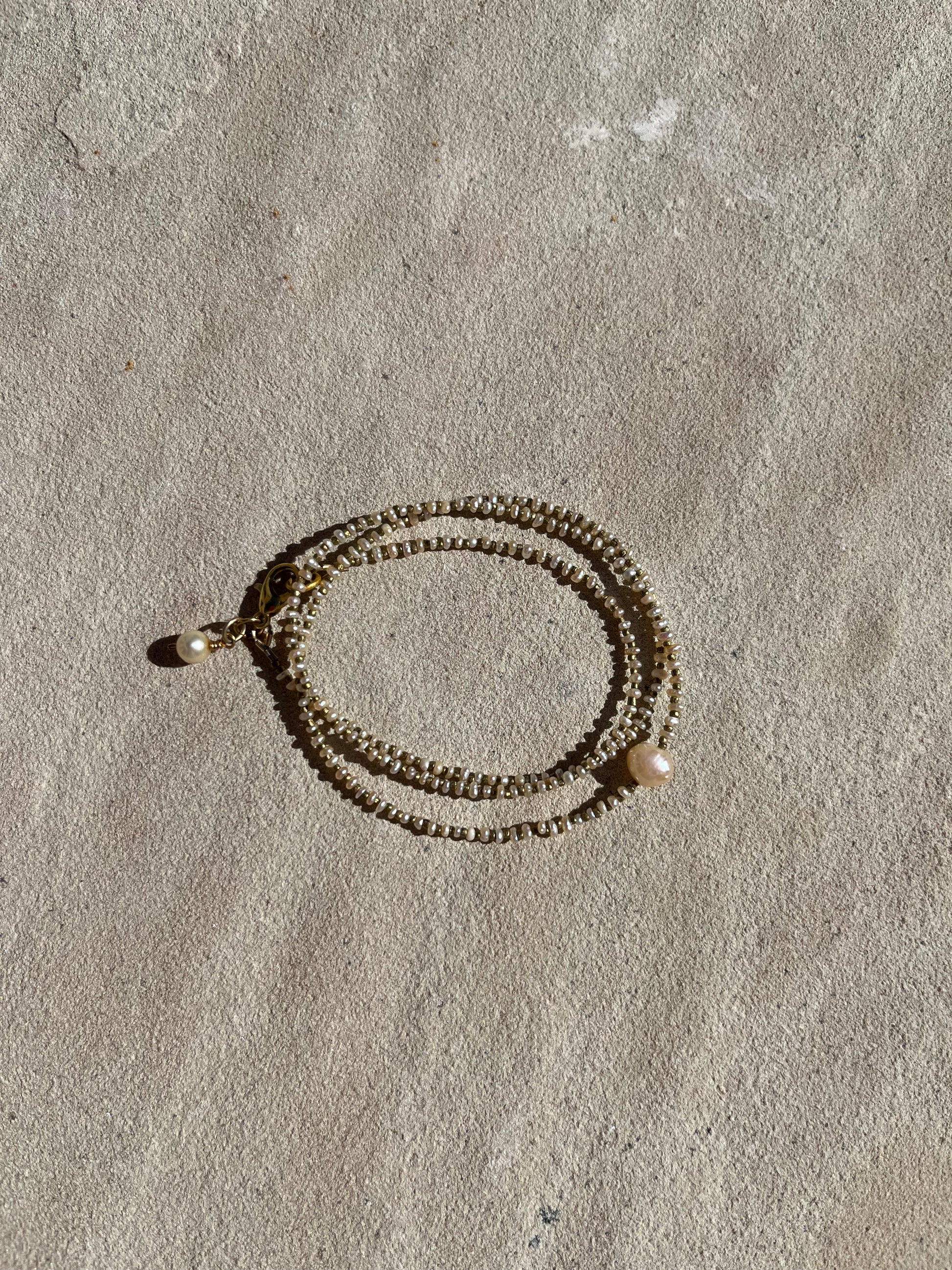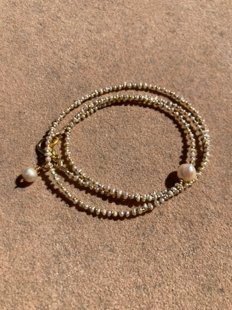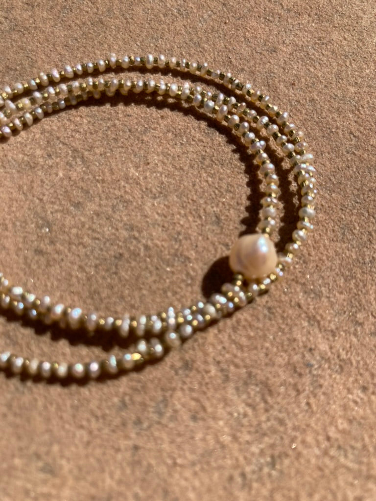 Bring out your inner beachcomber with teensy tinsy freshwater pearl seed beads, a freshwater pearl focal bead, and a gold plated clasp. Wear it as a wrap bracelet or necklace, add it to your stack or wear it solo!