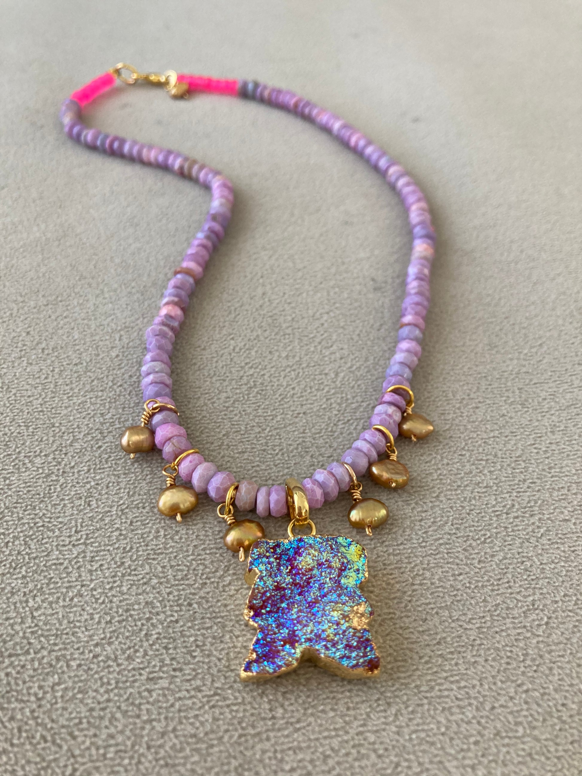 Sugar, spice, and rock & roll, girlies! This was a custom necklace for a very special little girl who has the energy and attitude of a rockstar. Dyed Peruvian opal, with hand-wrapped gold pearl charms surrounding a purple druzy.